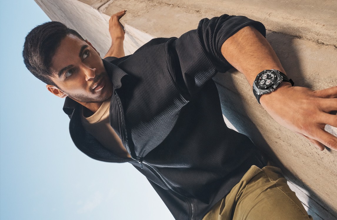 Black rubber strap with stainless steel AP pin buckle and interchangeable strap system. Additional brown calfskin strap