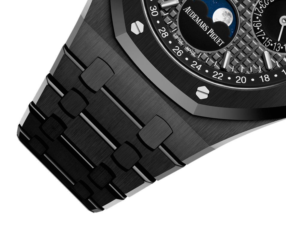 Slate grey dial with “Grande Tapisserie” pattern, black counters, white gold applied hour-markers and Royal Oak hands with luminescent coating, black inner bezel.