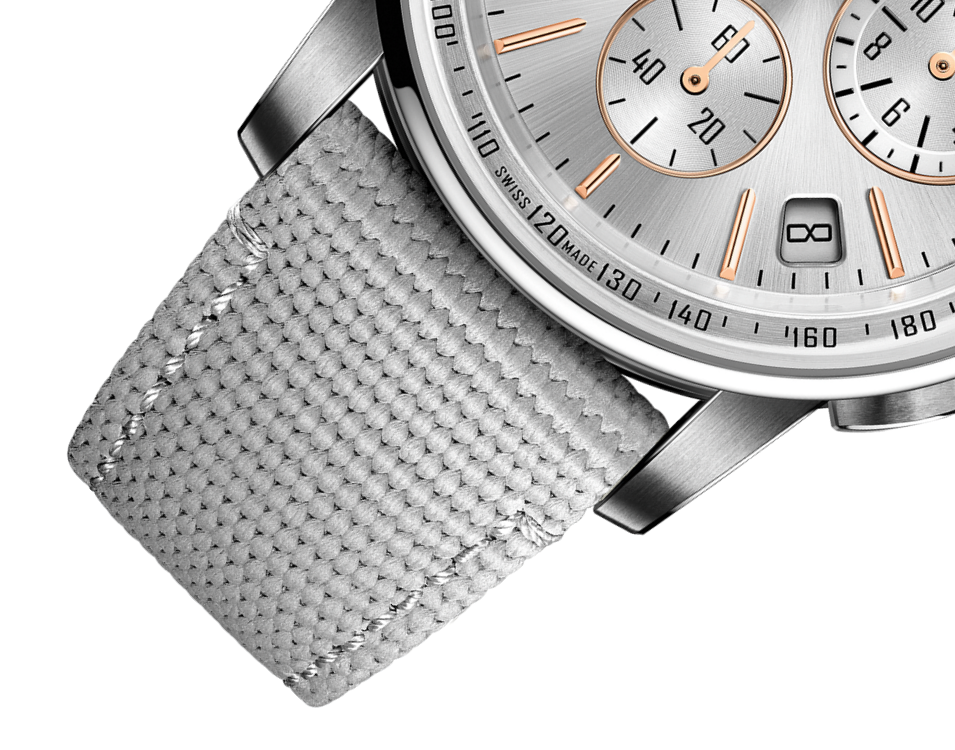Grey rubber-coated strap with 18-carat white gold pin buckle.