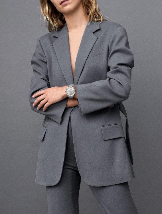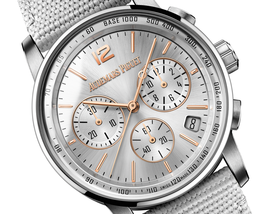 Grey lacquered dial with sunburst pattern, pink gold applied hour-markers and hands, grey lacquered inner bezel.