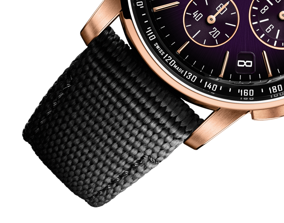 Smoked lacquered purple dial with sunburst pattern, 18-carat pink gold applied hour-markers and hands, black lacquered inner bezel.
