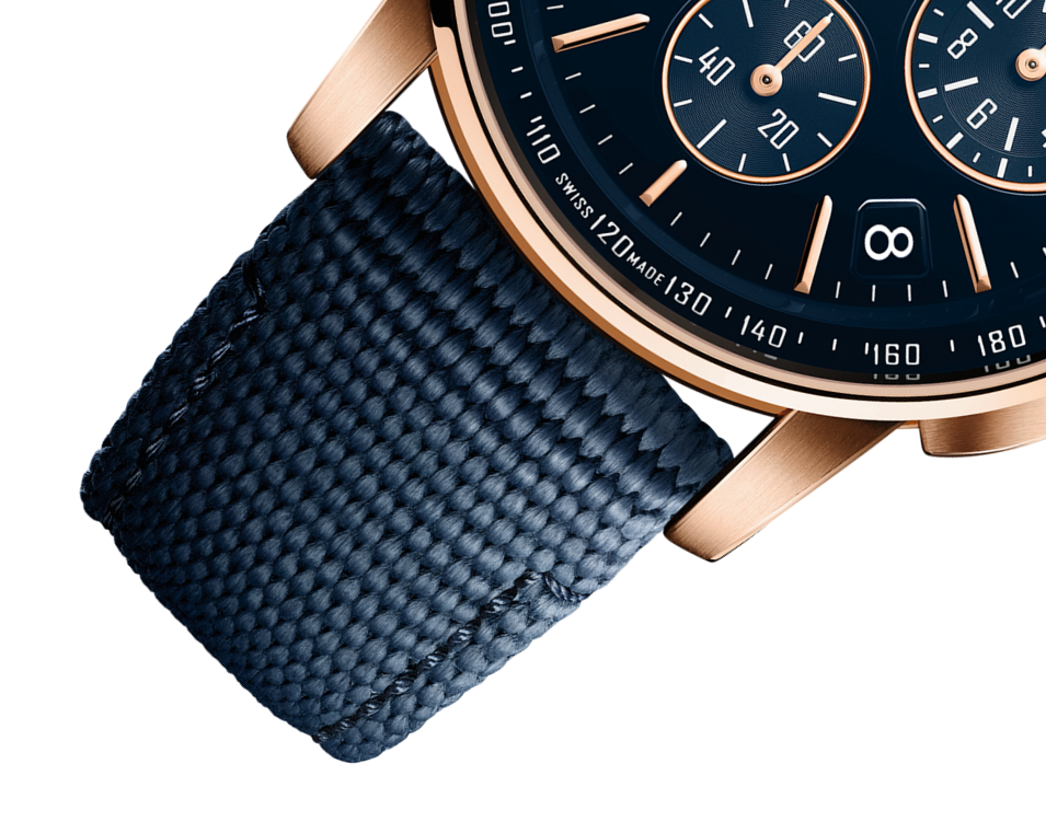 Blue rubber-coated strap with 18-carat pink gold pin buckle.
