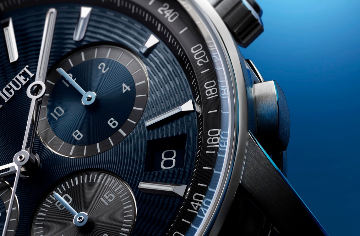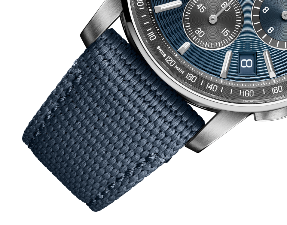 “Bleu nuit, Nuage 50” dial, blue counters and grey external zone, grey counter at 6, white gold hour-markers and hands with luminescent coating, grey inner bezel.