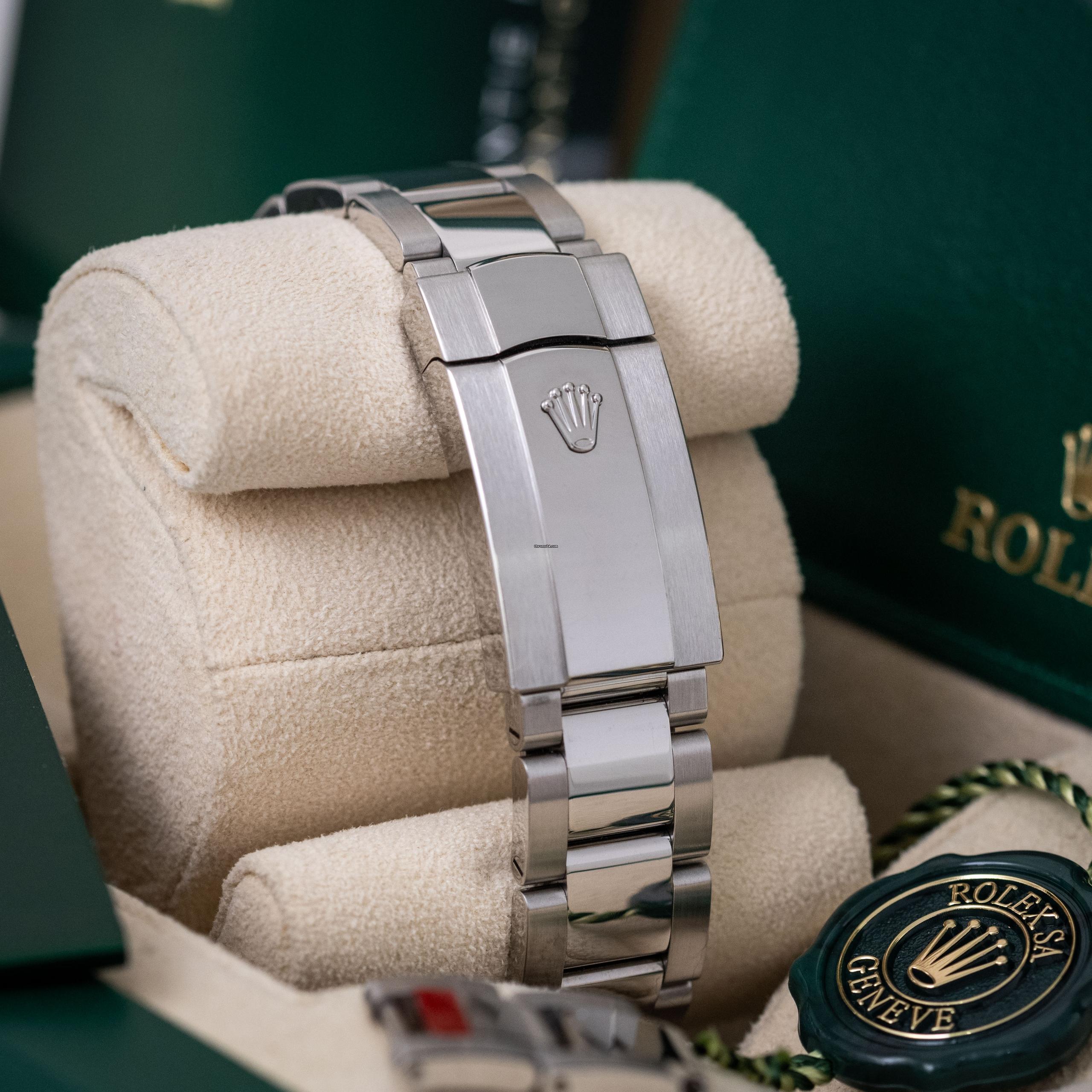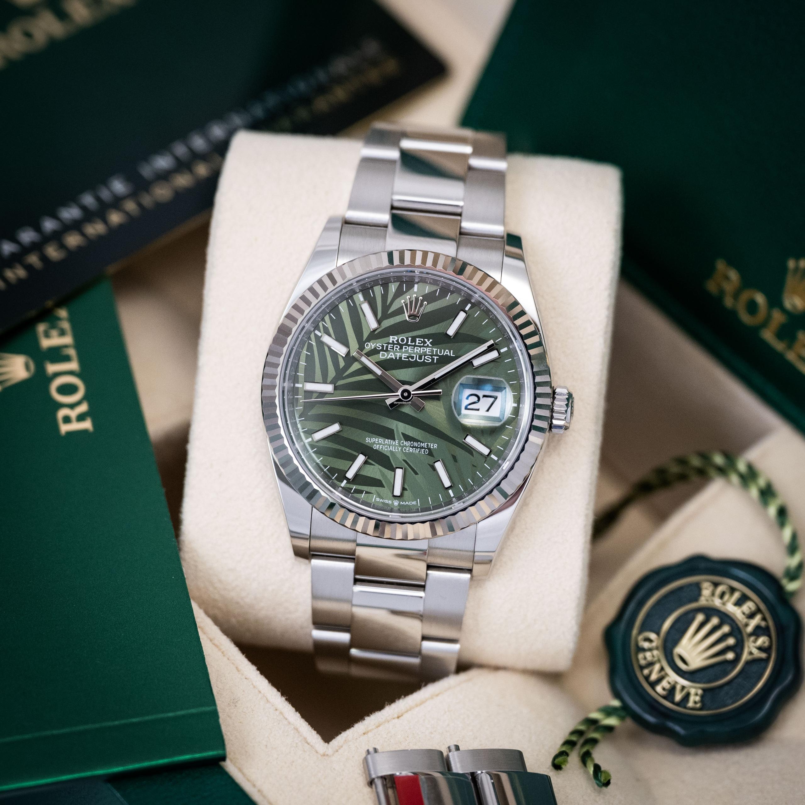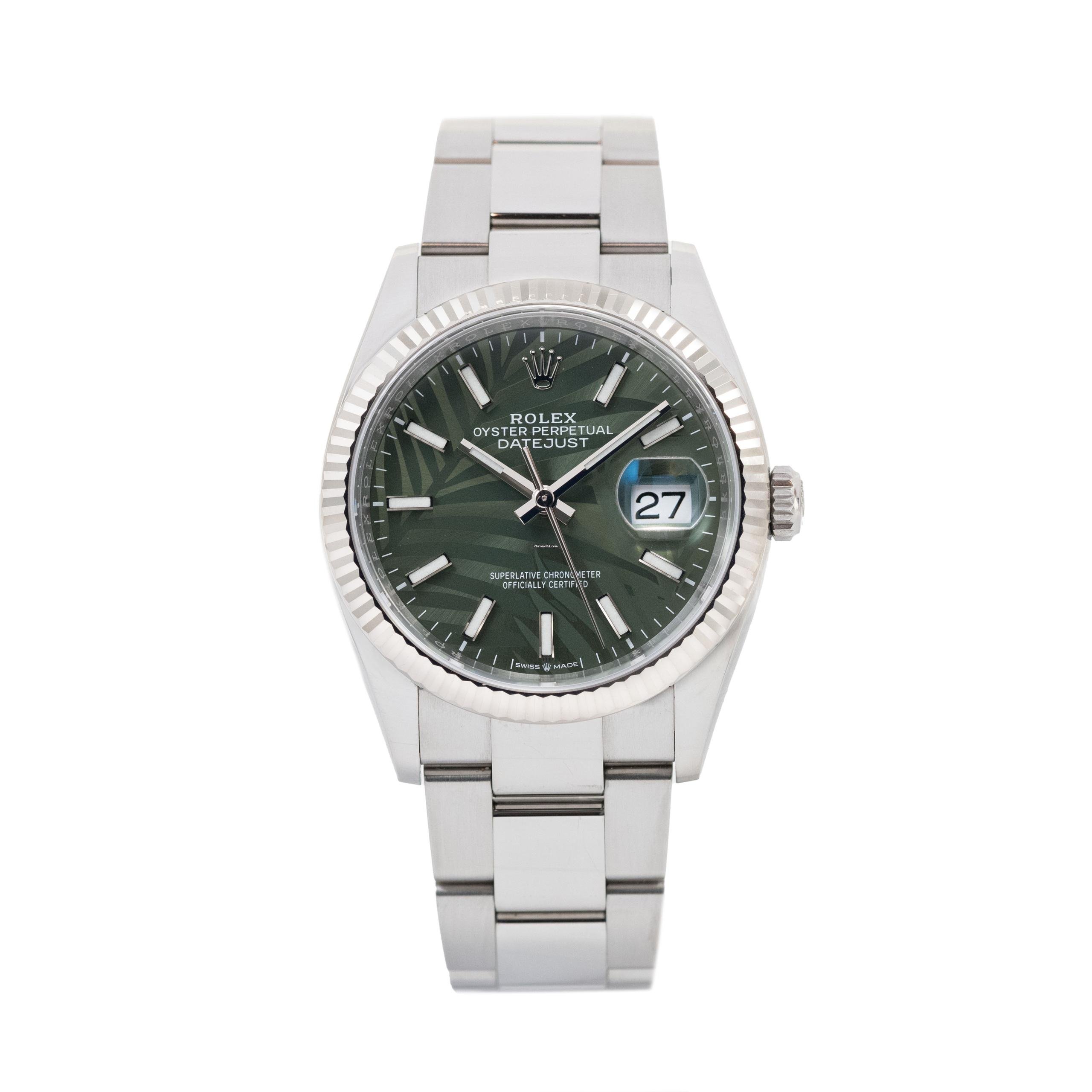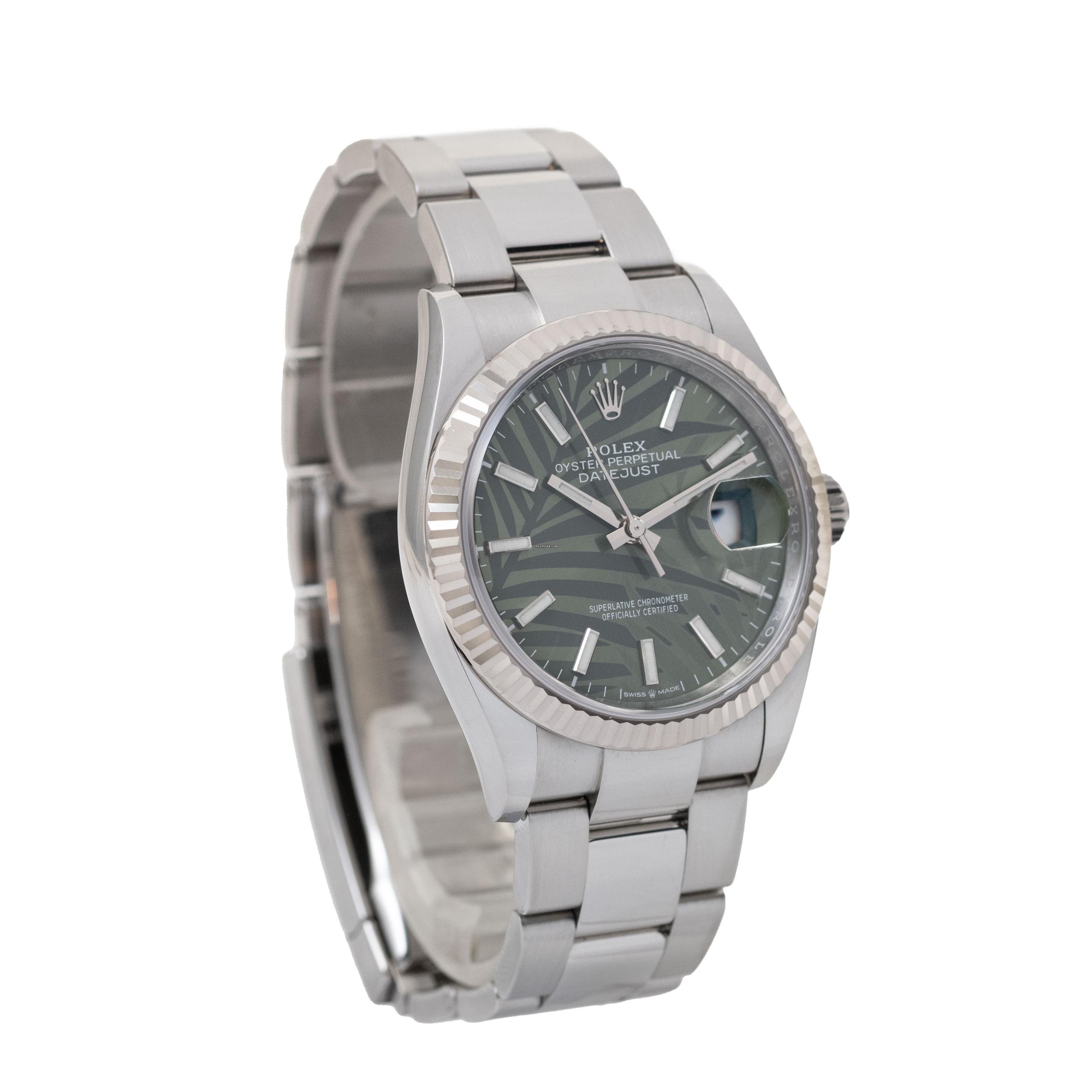Unworn Rolex Datejust 36mm, Oystersteel, and 18k White Gold watch. They have an Olive green, palm motif Dial, index hour markers fashioned from 18k gold. Minute markers around the outer rim. Highly legible Chromalight display with long-lasting blue luminescence. Monobloc middle case, solid screw-down case back, and winding crown. Scratch-resistant sapphire, Cyclops lens over the date. Date window located at the 3 o'clock position. The Fluted 18k White Gold bezel. The movement is mechanical self-winding, caliber 3235 with 31 jewels and 70 hours of power reserve. The Oystersteel Oyster bracelet of flat three-piece links. Folding Oysterclasp with Easylink 5mm comfort extension link. The water resistance is up to 100m/330ft. The Watch comes complete with store papers and a Rolex box. Will include 3 years Store Warranty.