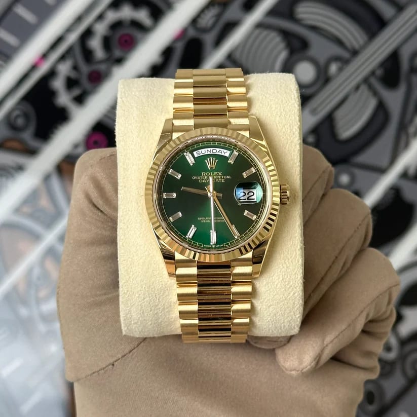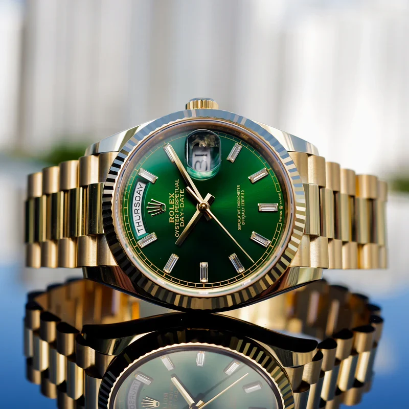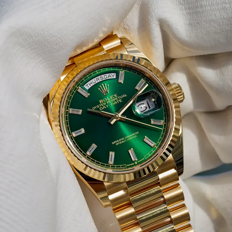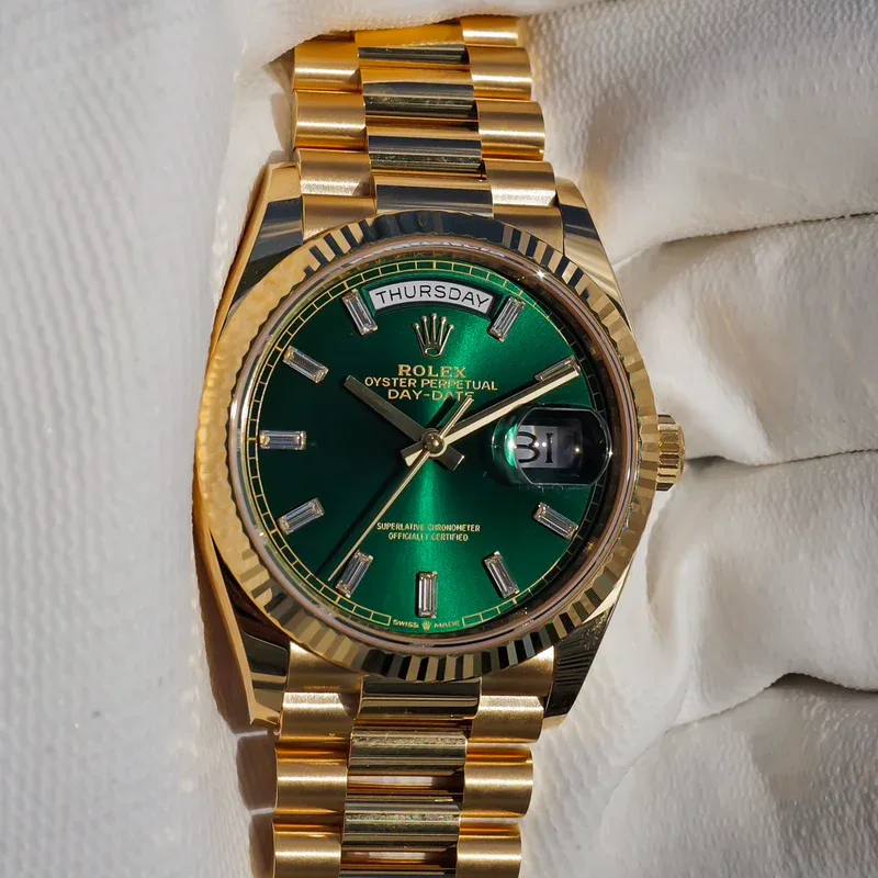 Explore the distinguished Rolex Day-Date, model M128238-0130, now available at The Watch Meister in Dubai. This exquisite timepiece, crafted from 18 ct yellow gold, features a classic green dial that exudes elegance and sophistication.