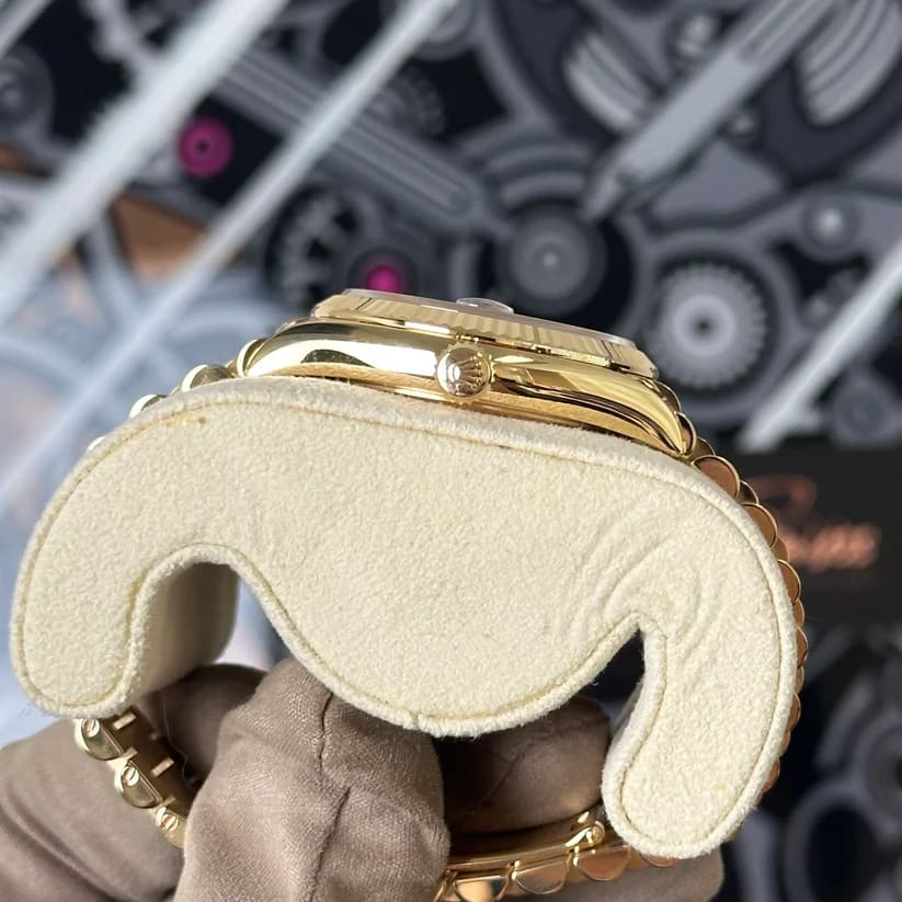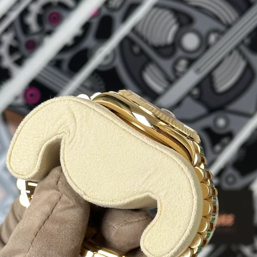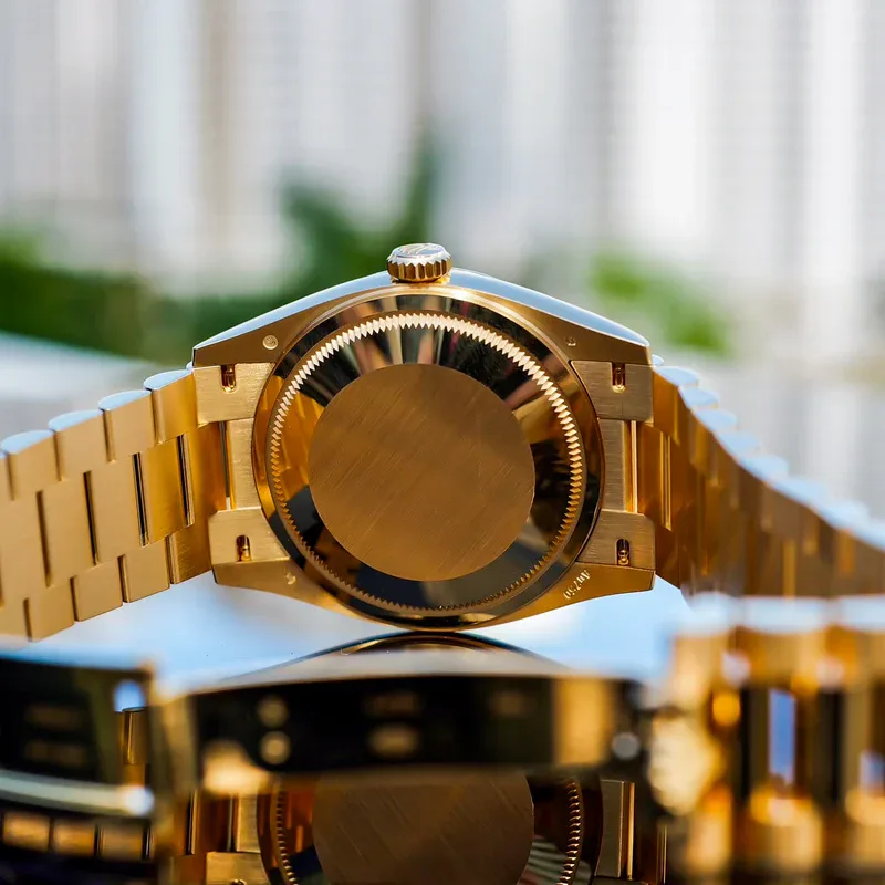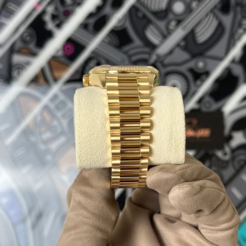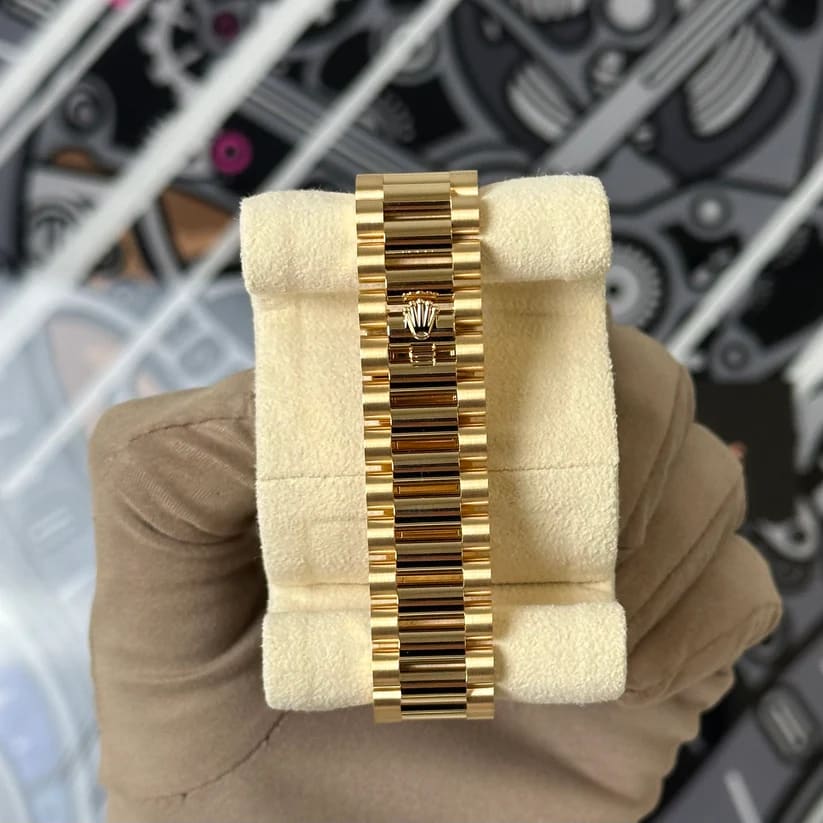 Additionally, the iconic President bracelet, crafted in 18 ct yellow gold, features semi-circular three-piece links that provide a comfortable fit. This elegant bracelet enhances the watch’s classic profile, making it suitable for both formal events and everyday elegance.