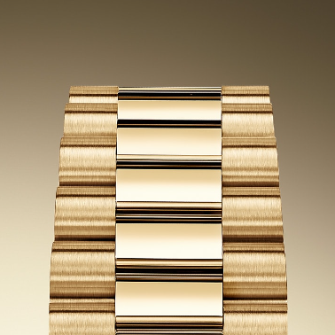 The design, development and production of Rolex bracelets and clasps, as well as the stringent tests they face, involve advanced high technology. And, as with all the components of the watch, aesthetic controls by the human eye guarantee impeccable beauty. The President bracelet, with its semi-circular three piece links, was created in 1956 for the launch of the Oyster Perpetual Day-Date. It represents the ultimate in refinement and comfort and is always made of carefully selected precious metals.