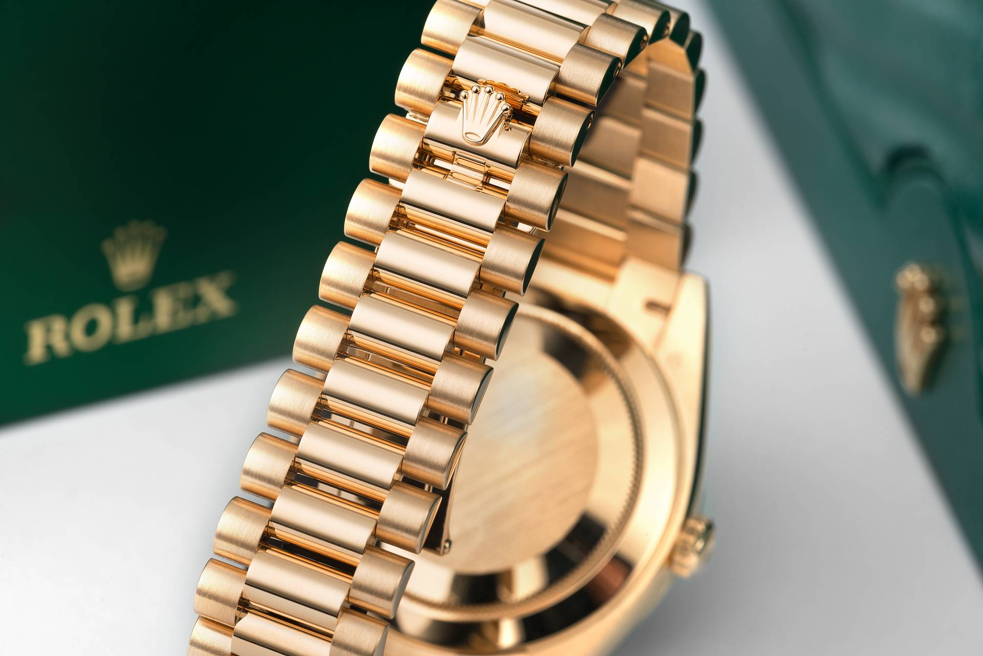 The Rolex fluted bezel is a mark of distinction. Originally, the fluting of the Oyster bezel had a functional purpose: it served to screw the bezel onto the case helping to ensure the waterproofness of the watch. It was therefore identical to the fluting on the case back, which was also screwed onto the case for waterproofness, using specific Rolex tools. Over time, the fluting became an aesthetic element, a genuine Rolex signature feature. Today the fluted bezel is a mark of distinction, in gold on this Day-Date 40.