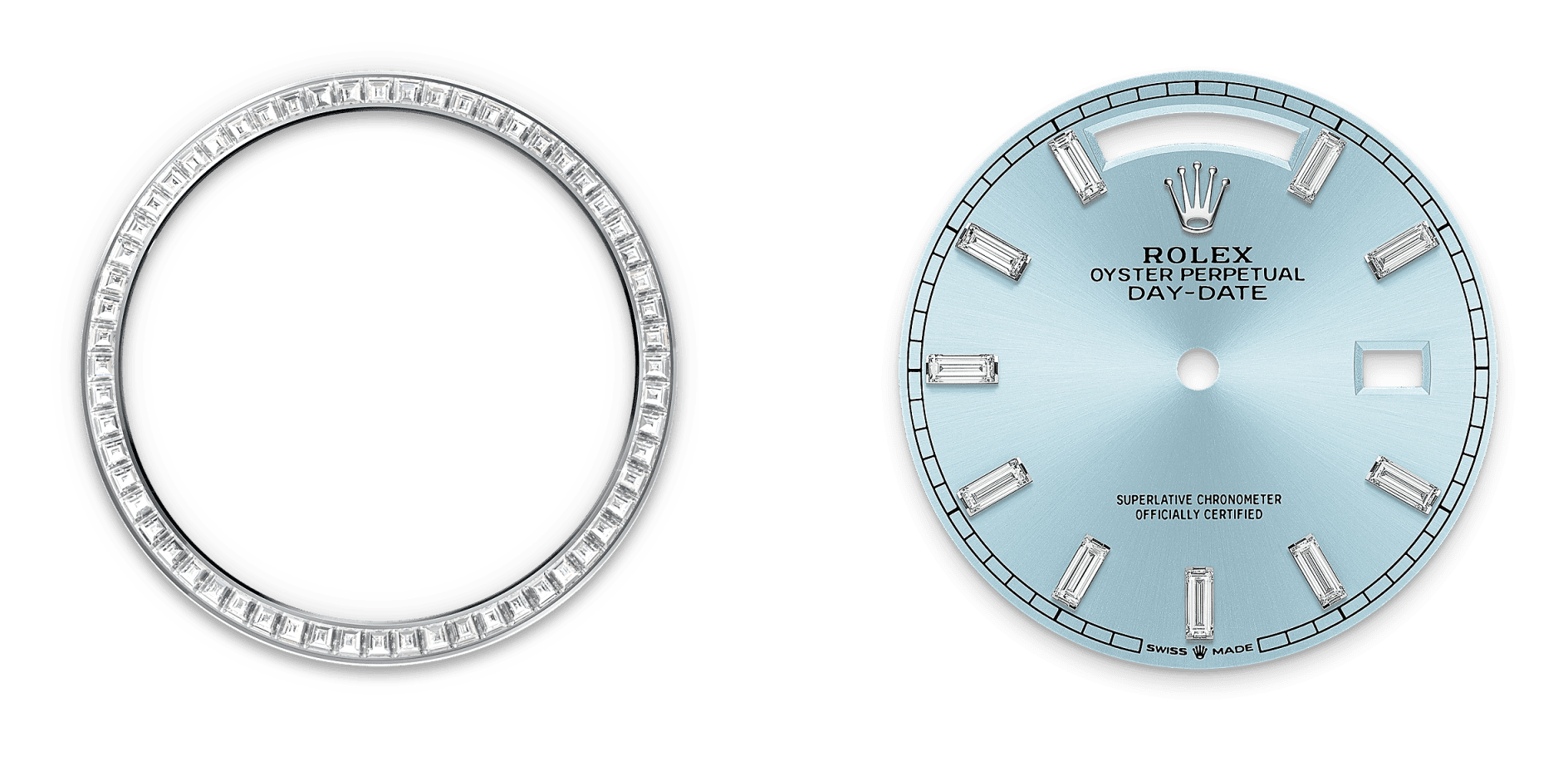 The dial of this spectacular watch is where true elegance meets functionality. The ice blue baguette index dial catches the eye with its unique hue, reminiscent of serene, icy landscapes. Adorned with gem-set and stick indices, the hour markers made of 904L stainless steel offer both durability and timeless beauty.