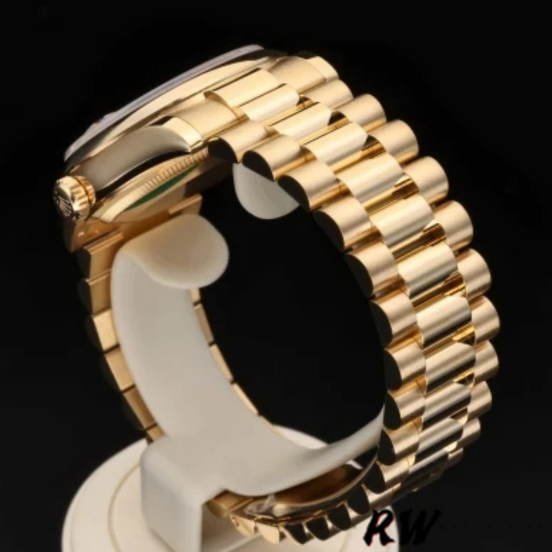 Rolex Day-Date 118208 Black Diamond Dial 36mm Unisex Replica Watch. 36mm yellow gold case with a yellow gold Rolex president bracelet. Fixed domed yellow gold bezel. Black dial with gold-tone hands and Diamonds numeral hour markers. Minute markers around the outer rim. Date display at the 3 o'clock position. Day of the week display centered on the 12 o'clock position. Scratch resistant sapphire crystal. Screw down crown. Solid case back. Round case shape.