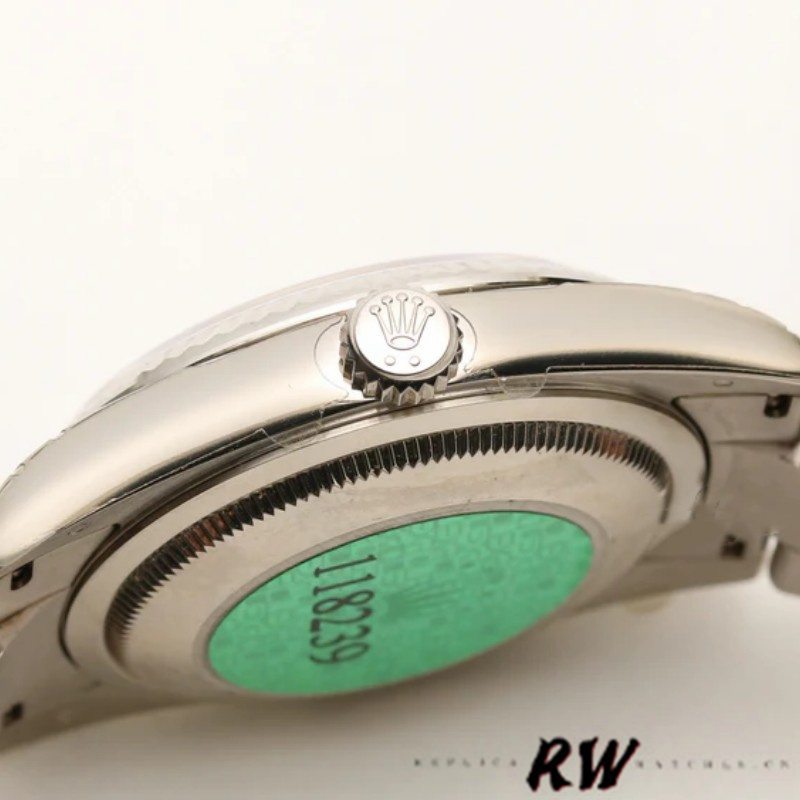 Rolex Day-Date 118239 Chocolate Brown Dial 36mm Unisex Replica Watch. 36mm white gold case with white gold fluted bezel.Chocolate Brown Dial with Roman Numerals, Date display at 3 o'clock position and day display at 12 o'clock position with a cyclops magnifying lens. White gold Oyster bracelet, hidden deployant clasp. Sapphire crystal. White gold case back.