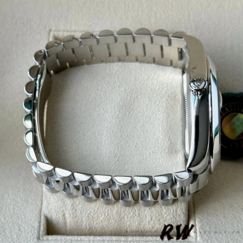 Rolex Day-Date 218206 Ice Blue Roman Numeral Dial Platinum 41MM Mens Replica Watch,has a Platinum 41 mm Round Case with Screw Down Crown and a Platinum Bezel.Scratch resistant sapphire crystal with Cyclops magnifier.Ice Blue dial with Roman Numerals hour markers.Date Window Displayed at 3 O'Clock,Day Window Displayed at 12 O'Clock,Platinum President Bracelet will look great on your wrist.