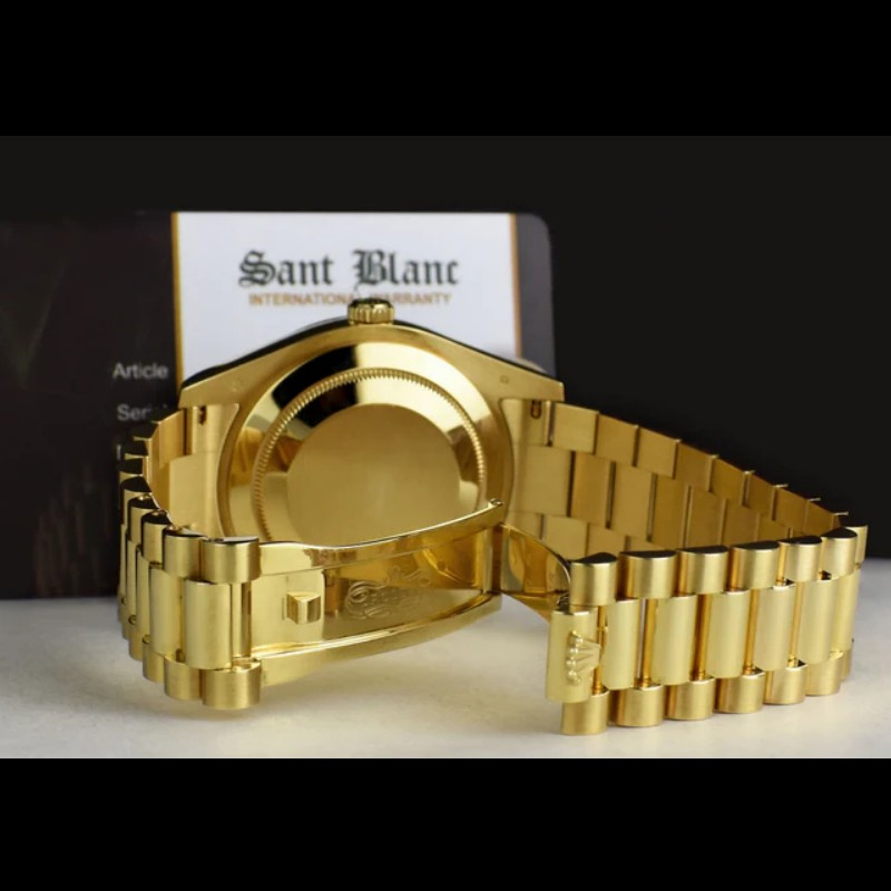Rolex Day-Date 218238 Ivory Dial Yellow Gold 41MM Mens Replica Watch, has a 41mm yellow gold case that has a solid case back,a screw-down crown, and a fluted yellow gold bezel.Scratch resistant sapphire crystal with Cyclops magnifier.Ivory Dial with Arabic Numerals Hour Markers.Date Window Displayed at 3 O'Clock,Day Window Displayed at 12 O'Clock,Yellow gold three-piece-link Presidential bracelet with a fold-over clasp.