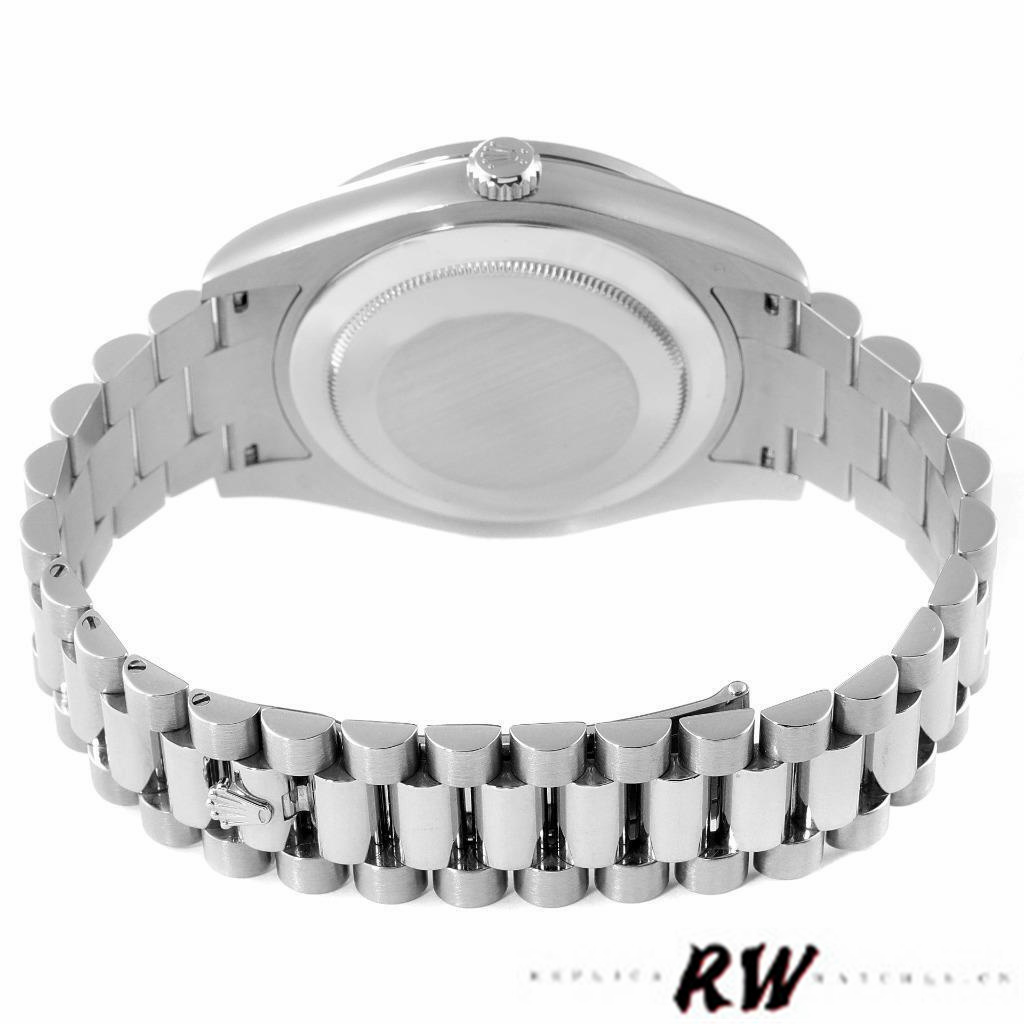 Rolex Day-Date 218349 Rhodium Grey Dial 41MM Mens Replica Watch,has a 41mm white gold case that has a solid case back with Screw Down Crown and Diamonds Bezel.Scratch resistant sapphire crystal with Cyclops magnifier.Rhodium Grey Dial with Roman Numerals Hour Markers,Date Window Displayed at 3 O'Clock,Day Window Displayed at 12 O'Clock,White gold three-piece-link Presidential bracelet with a fold-over clasp.