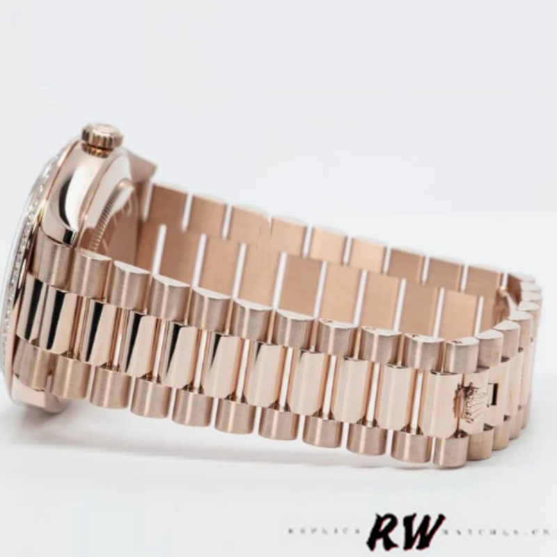 Rolex Day-Date 228345RBR Chocolate Brown Diagonal Motif Dial Diamond Bezel 40mm Mens Replica Watch, featuring a 40mm Everose Gold case, solid case back with screw-down crown and Diamond Bezel. Scratch-resistant sapphire crystal with Cyclops magnifying glass.Chocolate Brown Diagonal Motif Dial Index Hour Markers, date window at 3 o'clock, day of the week window at 12 o'clock,Everose Gold three-piece presidential bracelet with deployant clasp.