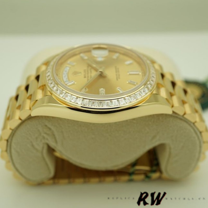 Rolex Day-Date 228398TBR Champagne Diamond Dial Diamond Bezel 40mm Mens Replica Watch, featuring a 40mm yellow gold case, solid case back with screw-down crown and Diamond Bezel. Scratch-resistant sapphire crystal with Cyclops magnifying glass.Champagne Dial with 10 Baquette-Cut Diamond Hour Markers, date window at 3 o'clock, day of the week window at 12 o'clock,Yellow Gold President Bracelet with Concealed folding Crownclasp deployment buckle.