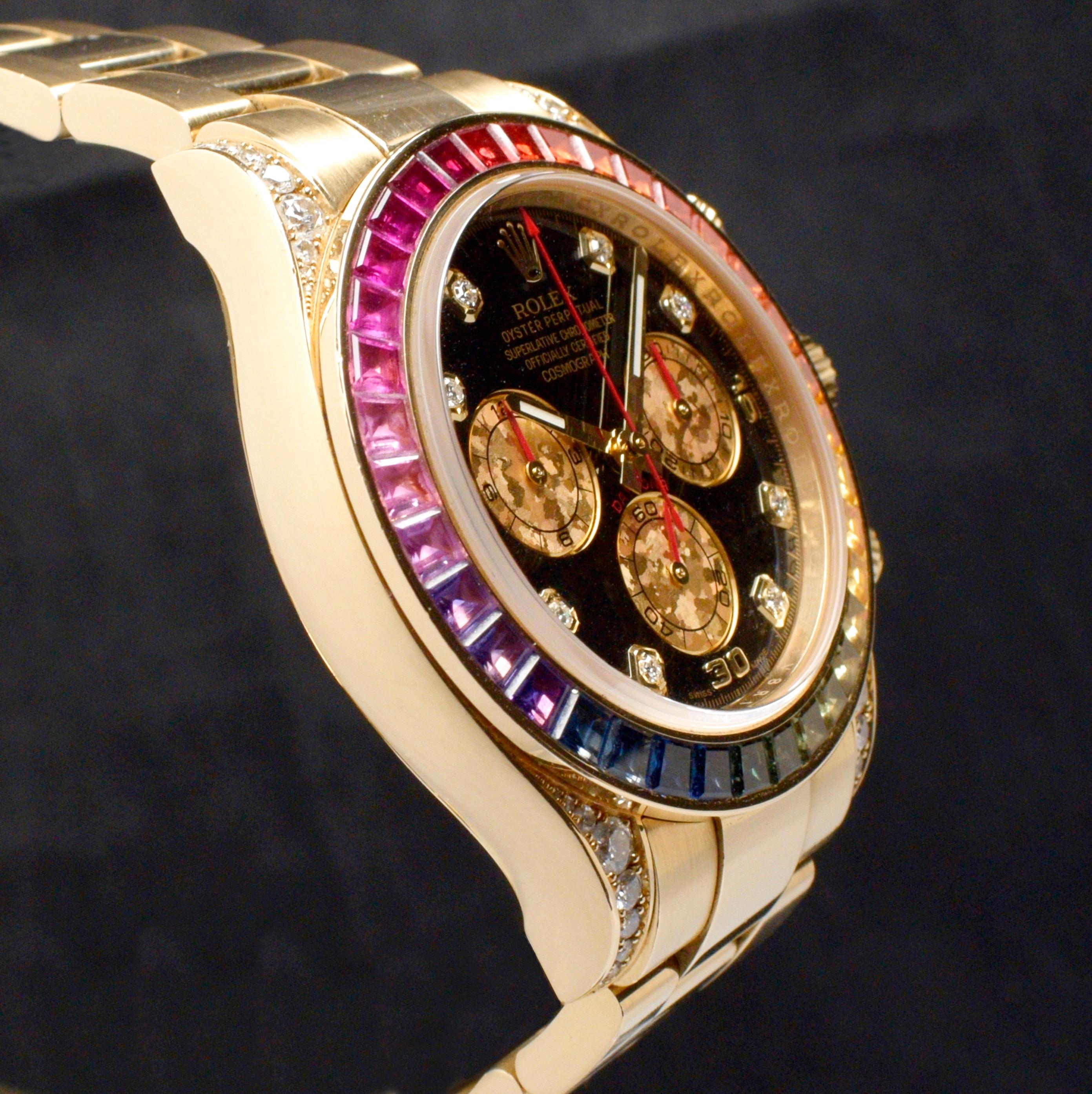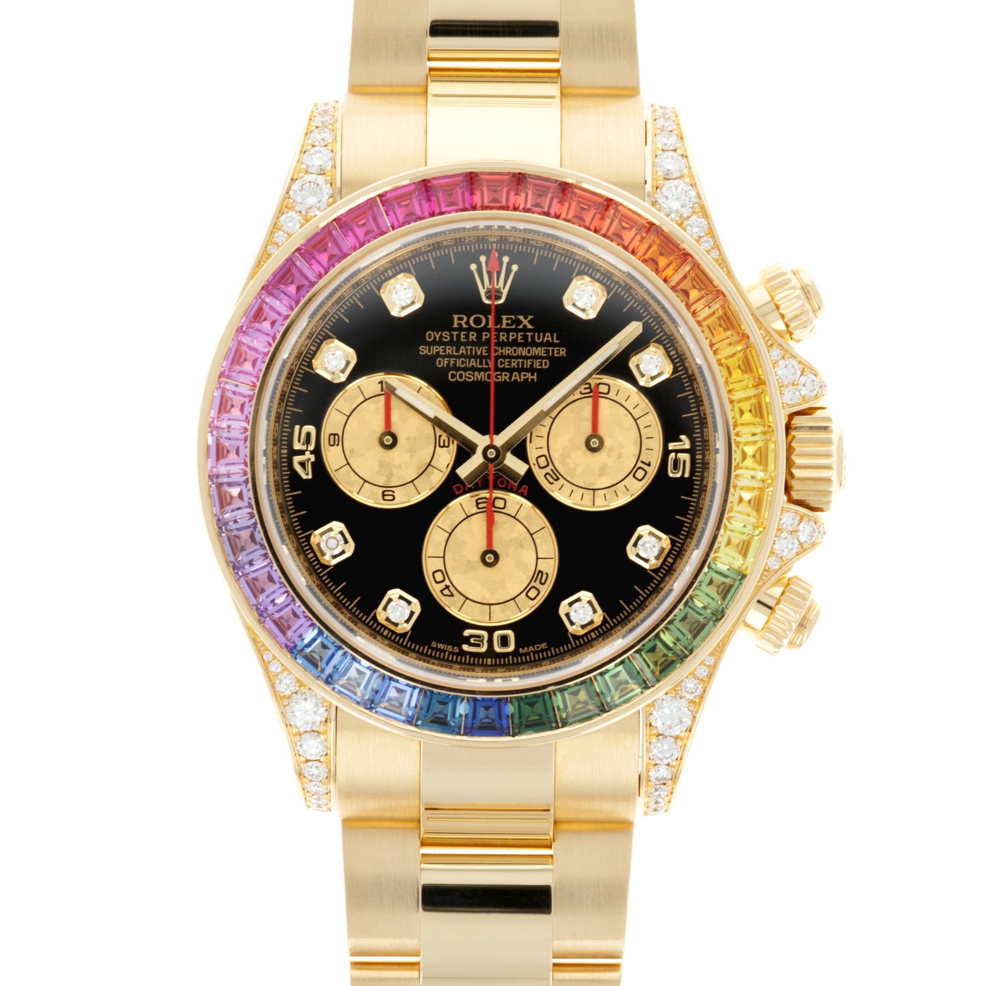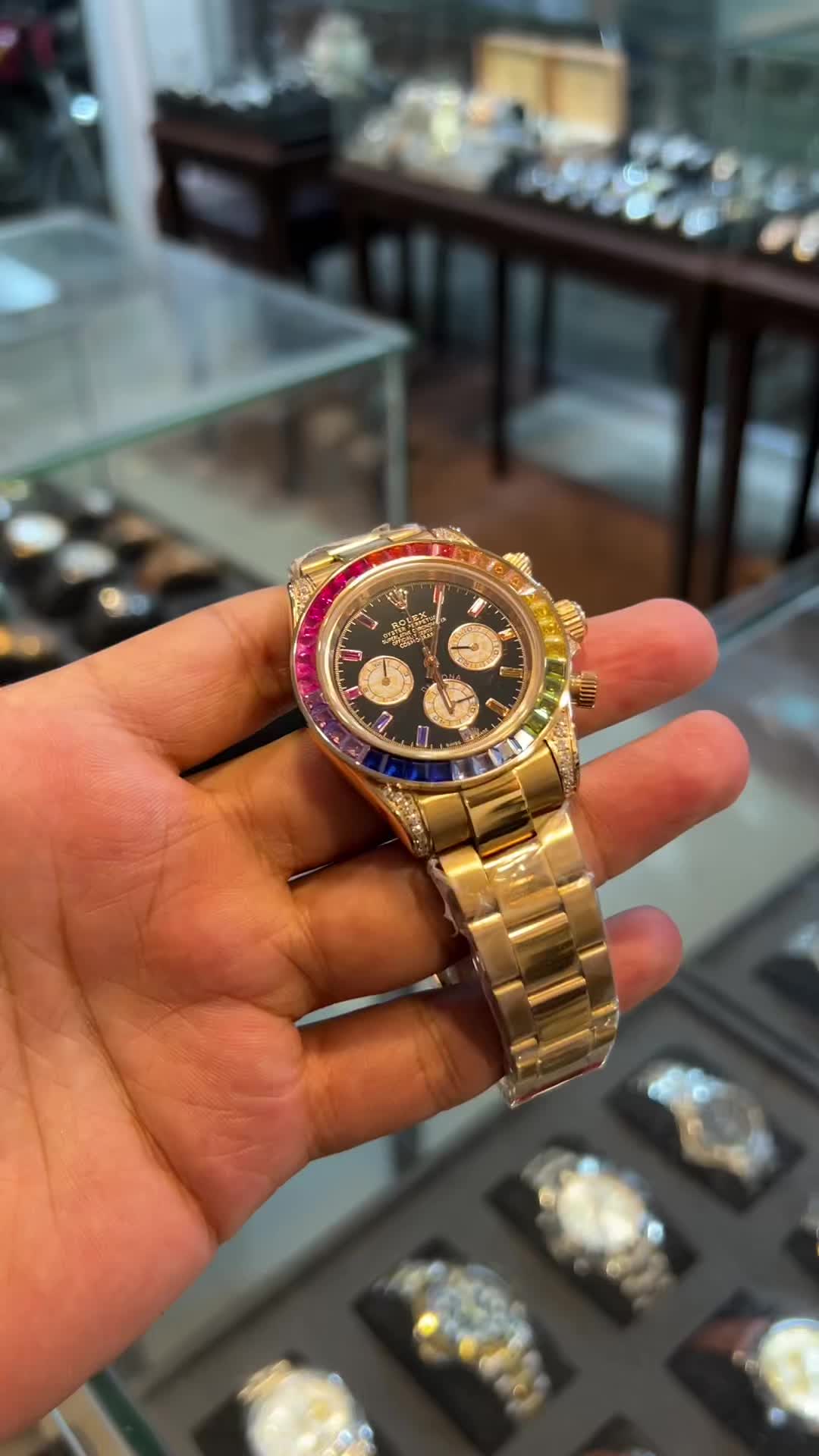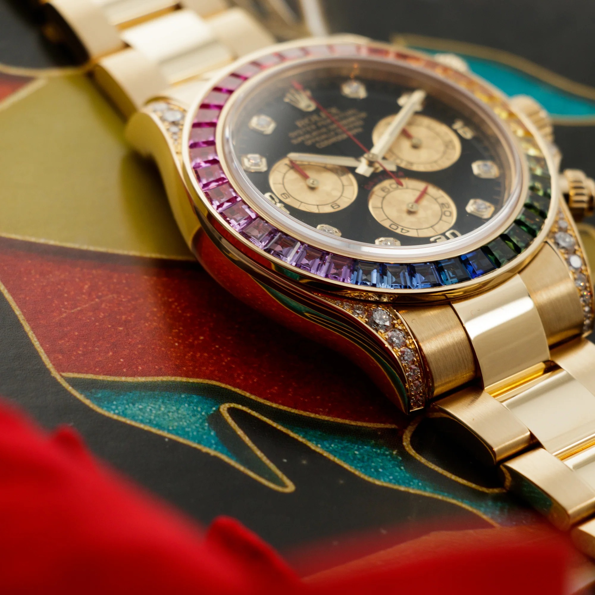 - Rainbow Diamond Design: The colorful gemstones are set to mimic the signature "Rainbow Diamond" style, giving the watch a luxurious and radiant appeal.