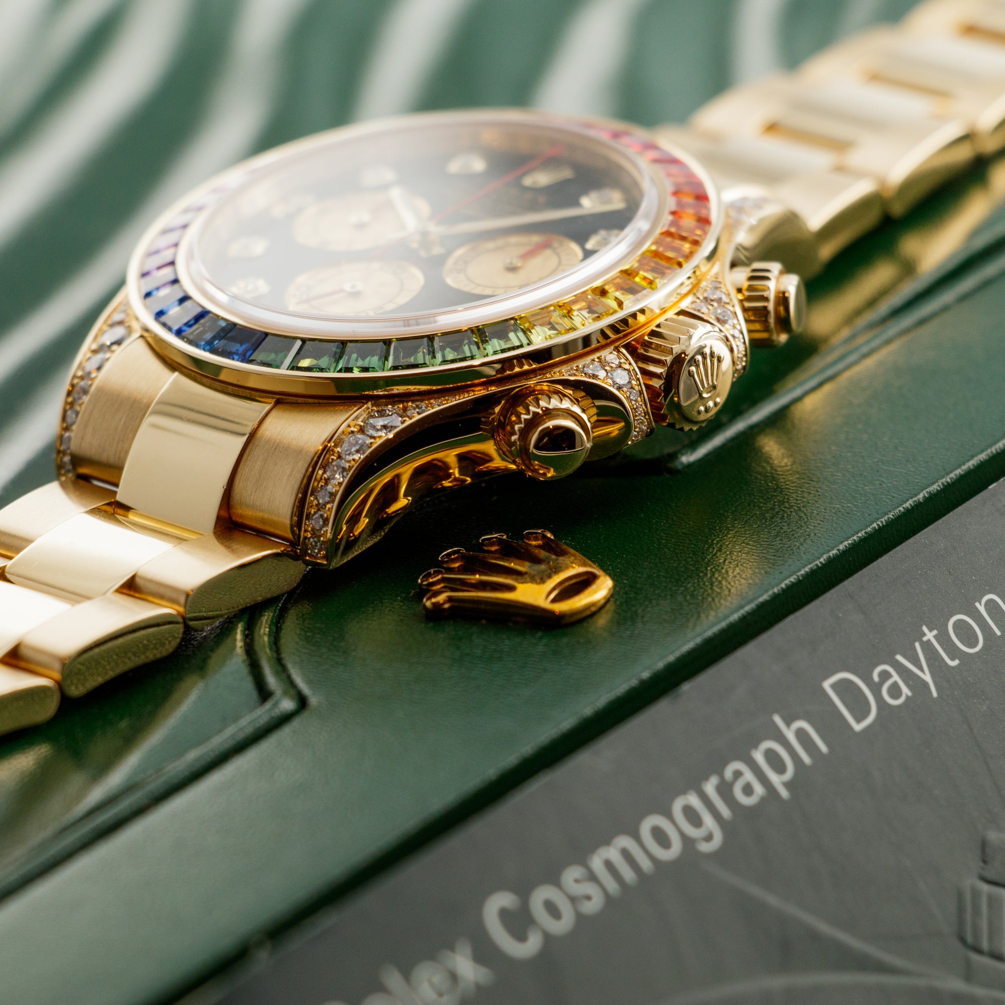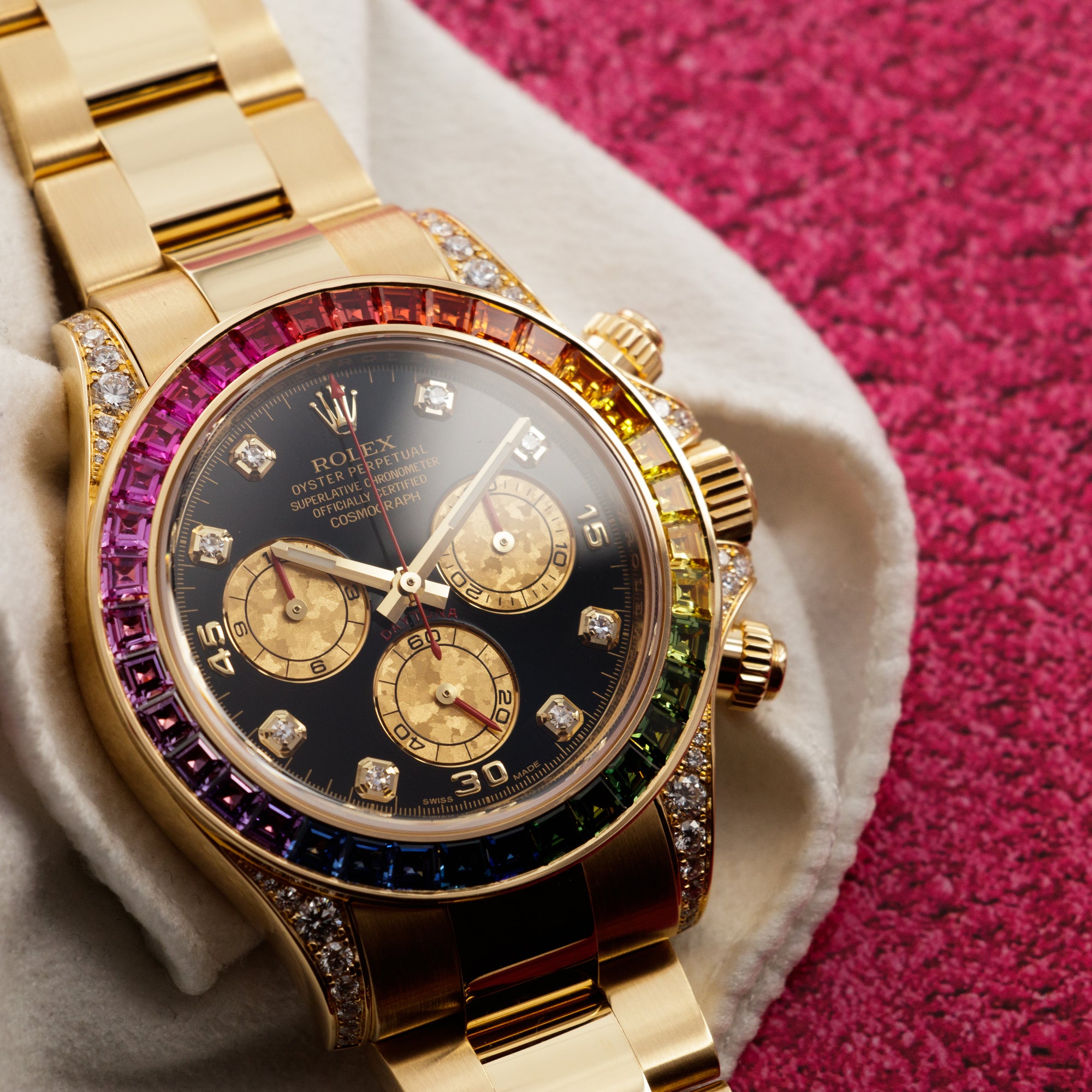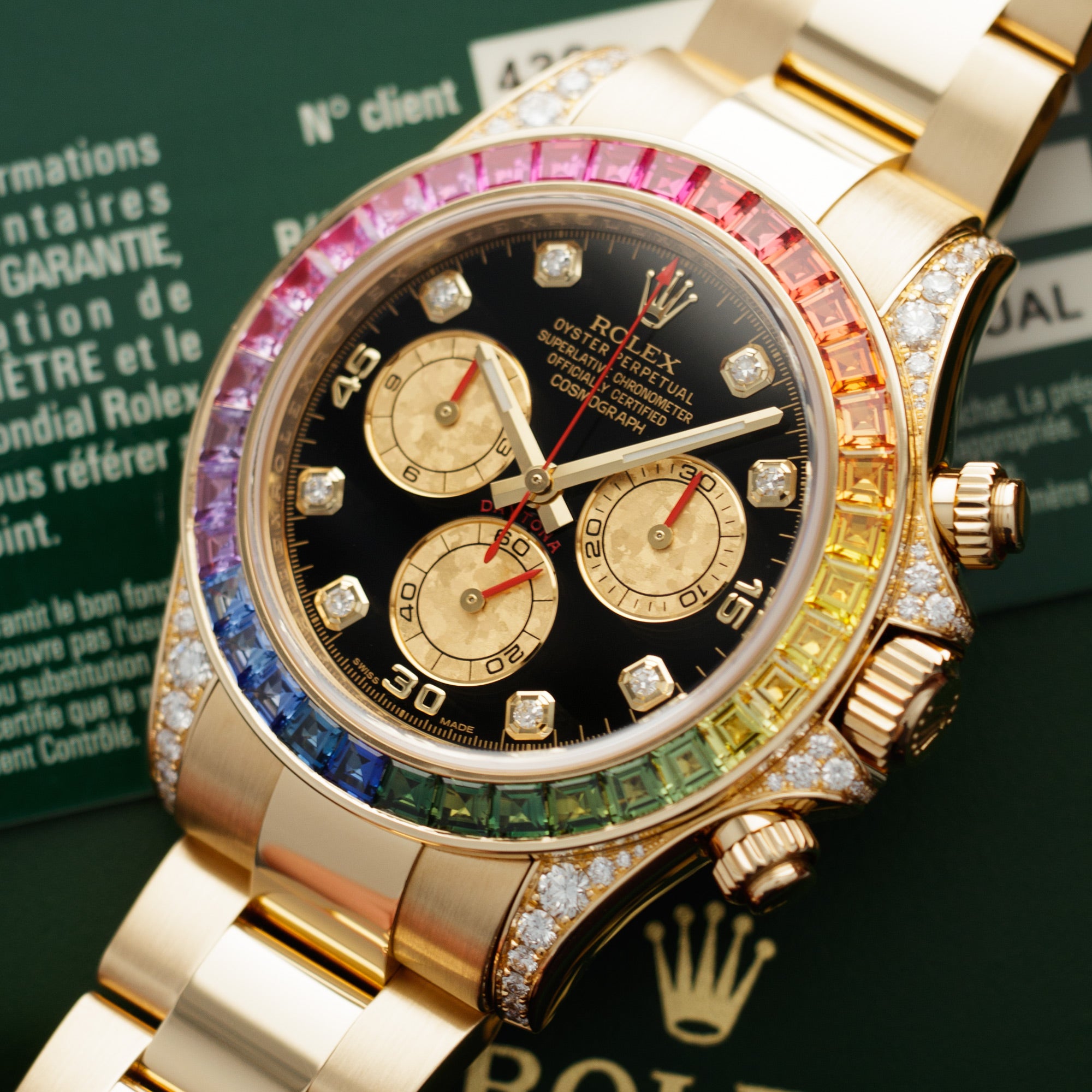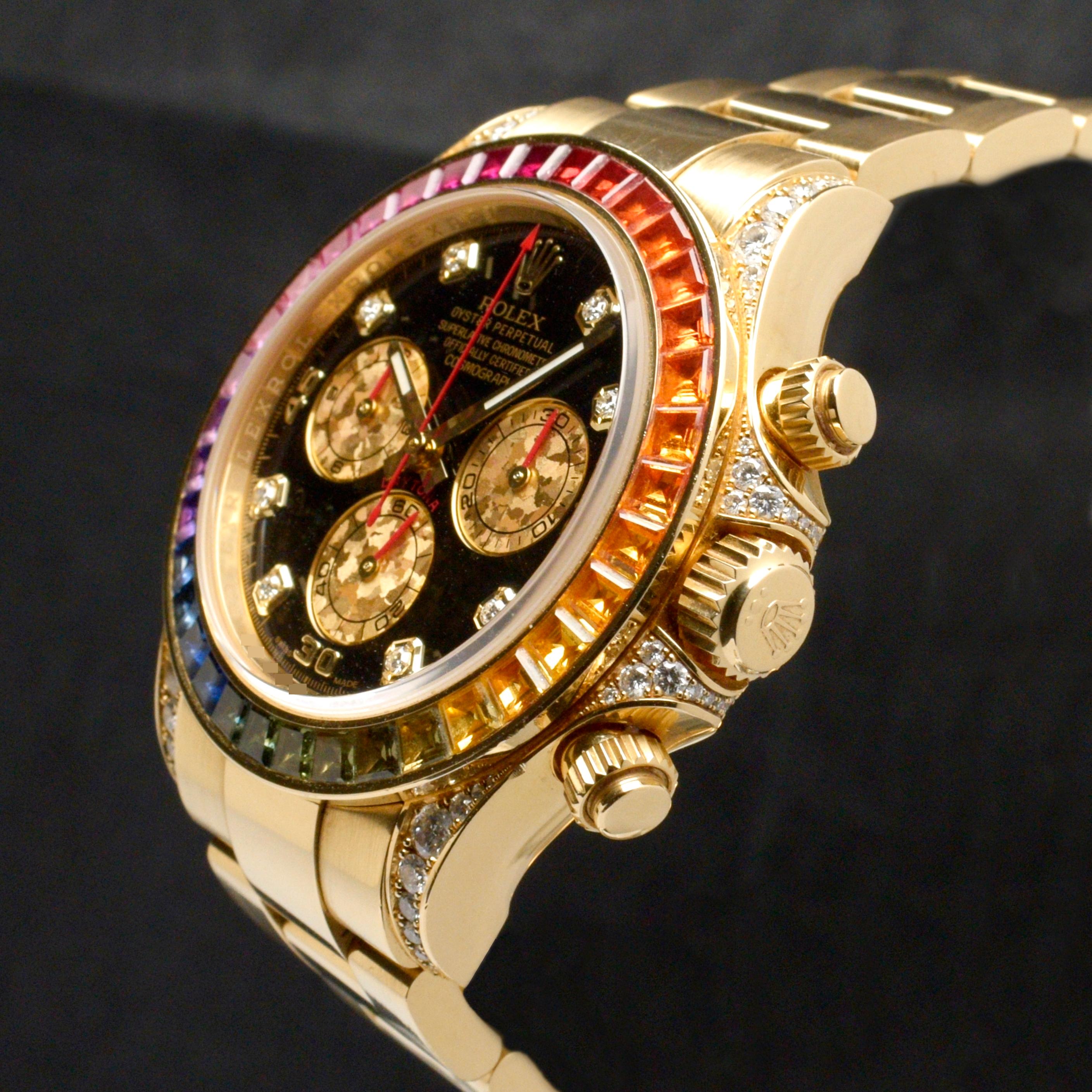 - Rainbow Diamond Design: The colorful gemstones are set to mimic the signature "Rainbow Diamond" style, giving the watch a luxurious and radiant appeal.