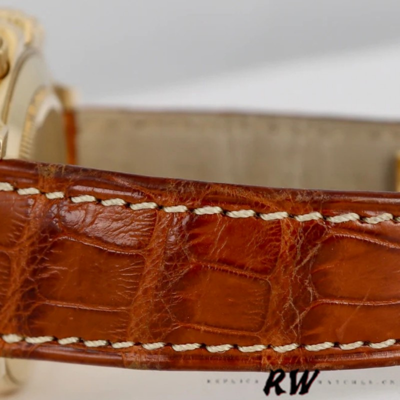 Rolex Cosmograph Daytona 116518 Brown Leather Strap 40mm Mens Replica Watch has a black profile attached to 40mm yellow gold case.Cerachrom bezel showing tachymeter markings. Black dial with luminous gold-tone hands and index hour markers. Minute markers around the outer rim. Brown Leather Strap with Pattern.Scratch Resistant Sapphire Crystal.Multiple precision functions, including center hour, small seconds and chronograph.