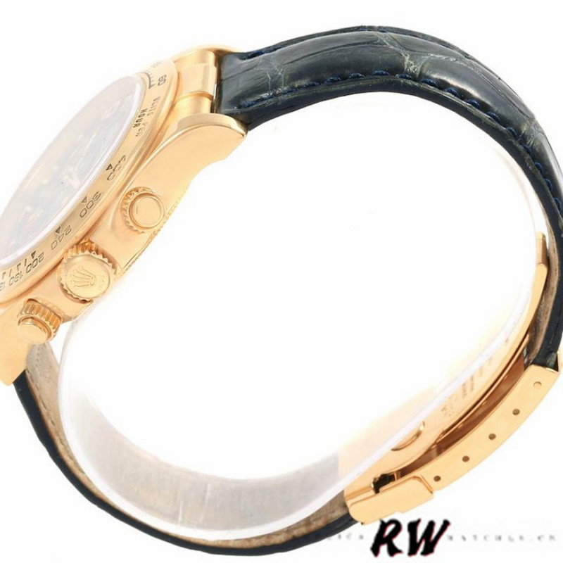 Rolex Cosmograph Daytona 116518 Leather strap Blue Dial 40mm Mens Replica Watch features an easy-to-wear 40mm yellow gold case paired with a matte cobalt blue dial with red chronograph hands and exceptionally lumed yellow gold Arabic numerals.Special screw-down push buttons. Yellow gold tachymeter engraved bezel. Scratch resistant sapphire crystal. Blue dial with arabic numerals. Small seconds hand at 6 o'clock. Centre chronograph hand, 30-minute counter at 3 o'clock and 12-hour counter at 9 o'clock. Brown leather strap with yellow gold deployant buckle.