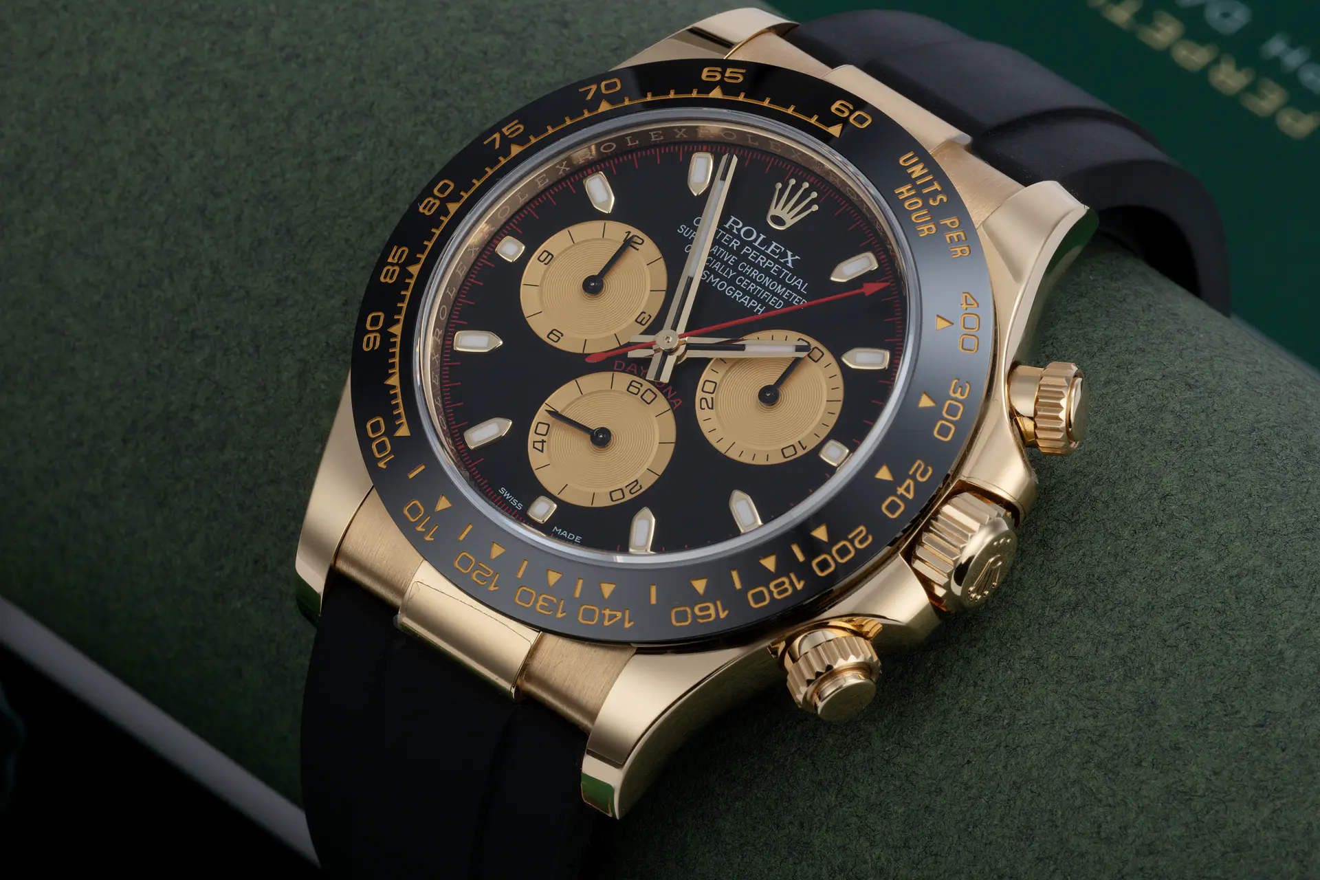 A key part of the model’s identity is the bezel moulded with a tachymetric scale for measuring average speeds of up to 400 miles or kilometres per hour. Blending high technology with sleek aesthetics, the black bezel is reminiscent of the 1965 model that was fitted with a black Plexiglas bezel insert.