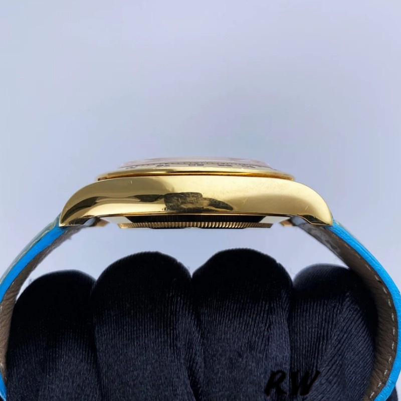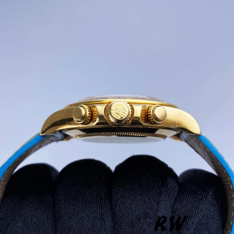 Rolex Daytona 116518 Blue leather strap MOP Dial 40mm Mens Replica Watch. 40mm yellow gold case with yellow gold tachymeter bezel. Mother of pearl dial with gold hands and Roman numeral hour marker. Three sub-dials. Small seconds hand at 6 o'clock. 30-minute counter at 3 o'clock. 12-hour counter at 9 o'clock. Minute maker on the outer dial. Blue leather strap with yellow gold fold over clasp with safety. Will fit up to 6.5-Inch wrist.