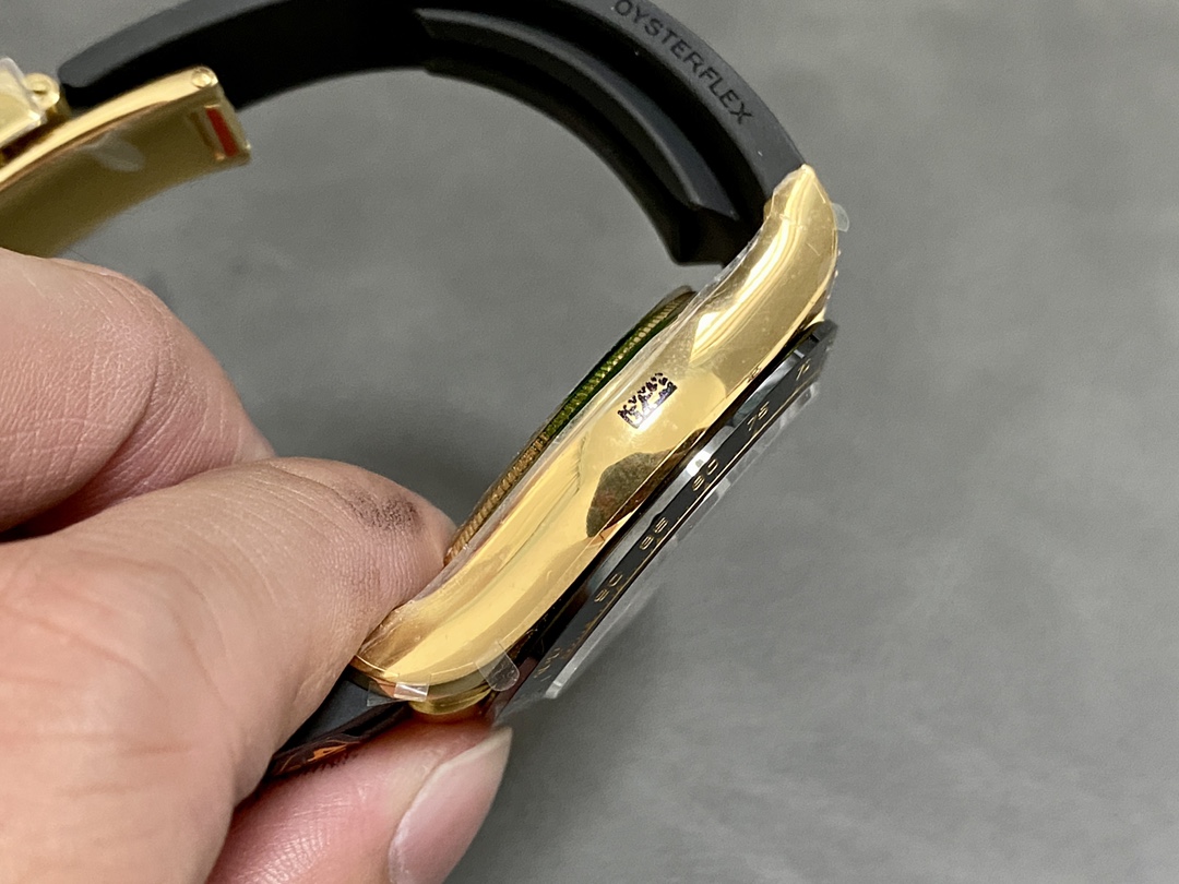Rolex Daytona 116518LN Black Dial Yellow Gold 40mm Mens Replica Watch has a black profile attached to 40mm case.Cerachrom bezel showing tachymeter markings. Black dial with luminous gold-tone hands and index hour markers. Minute markers around the outer rim. Black rubber Oysterflex strap with Pattern.Scratch Resistant Sapphire Crystal.Multiple precision functions, including center hour, small seconds and chronograph.