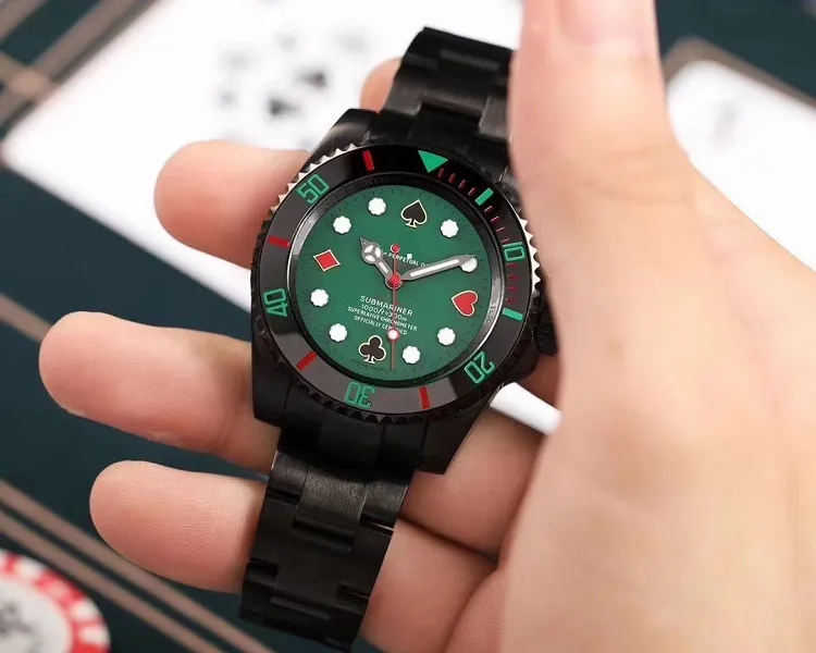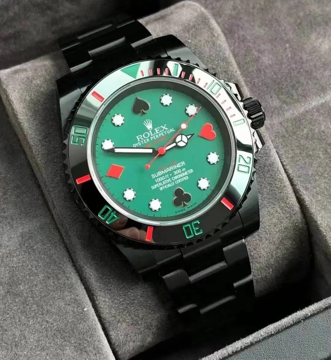BLAKEN Spades and Hearts♥️Poker♠️ROLEX Rolex Submariner Special Edition! Slow work makes fine work. One watch can make you re-understand the craftsmanship of the replica world. The latest model of BLAKEN, the world's strongest Rolex modification factory, combines Rolex's most popular green and black water ghosts with poker elements. The classic is presented again. It is 40mm in size and uses Seagull 2824/integrated 3135 blue oil silk movement! Fully automatic mechanical movement, 904L stainless steel deep DLC black plating (wear-resistant and resistant DLC coating) sapphire glass with anti-counterfeiting mark at 6 o'clock, super ice blue luminous 300 meters waterproof, and the green dial is inlaid with three-dimensional poker nails! Bold innovation is only to satisfy the desire of major watch friends to modify watches🔥