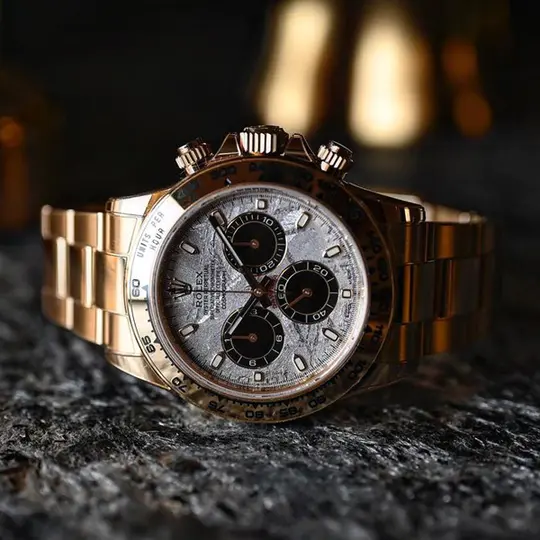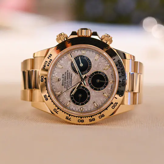 During its journey, the centre of the meteorite is gradually transformed, producing highly unusual metallic patterns, resulting from the very slow cooling of molten asteroid cores. The designers at Rolex create from these configurations a unique treasure for some of the most prestigious models, including this Cosmograph Daytona.