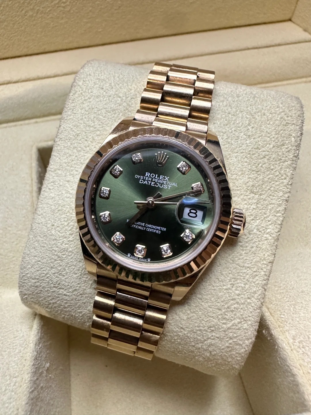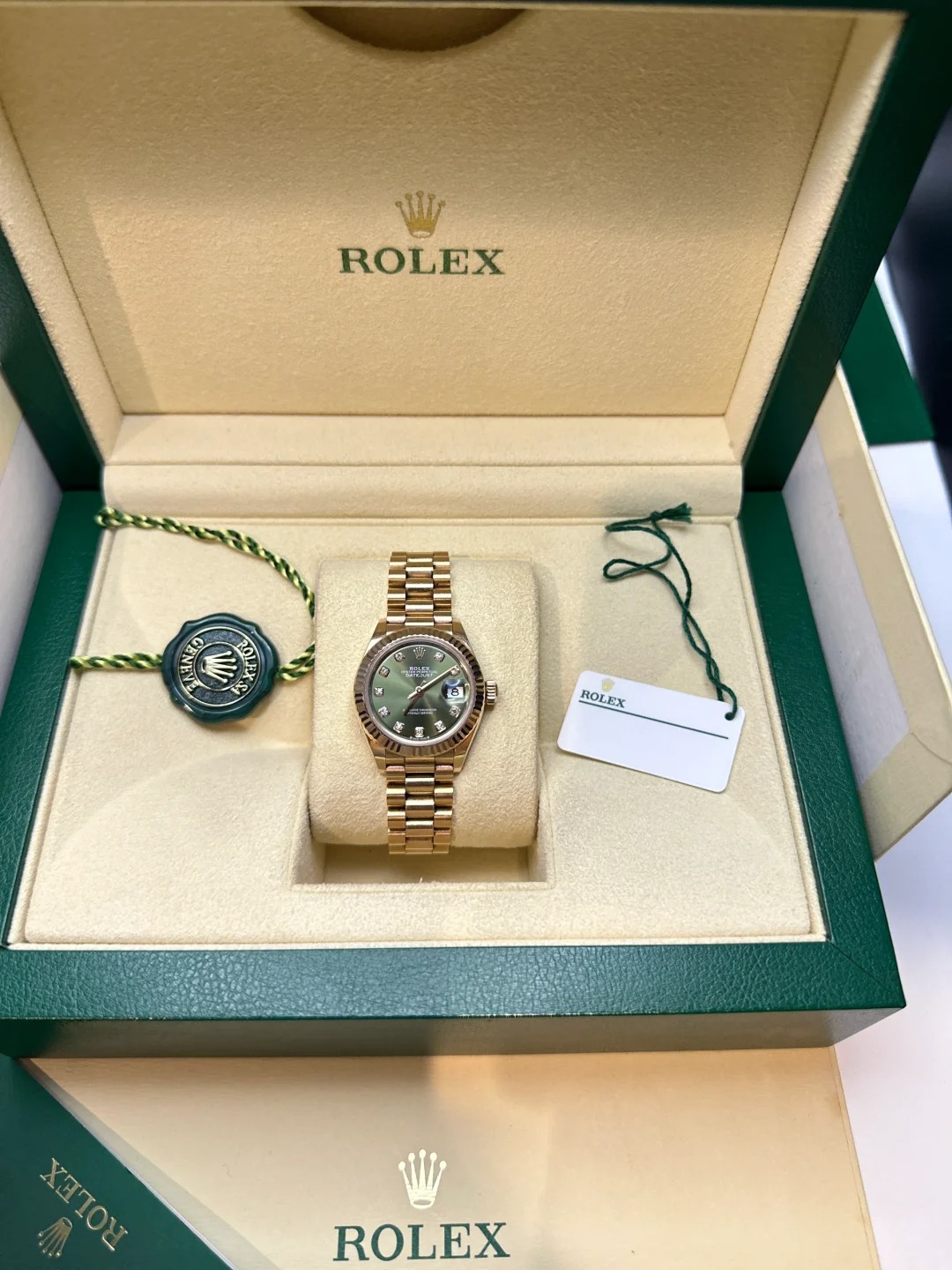 The Rolex fluted bezel is a mark of distinction. Originally, the fluting of the Oyster bezel had a functional purpose: it served to screw the bezel onto the case helping to ensure the waterproofness of the watch. It was therefore identical to the fluting on the case back, which was also screwed onto the case for waterproofness, using specific Rolex tools. Over time, the fluting became an aesthetic element, a genuine Rolex signature feature. Today the fluted bezel is a mark of distinction, in gold on this Lady-Datejust.