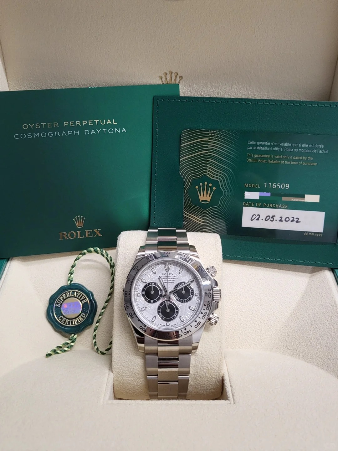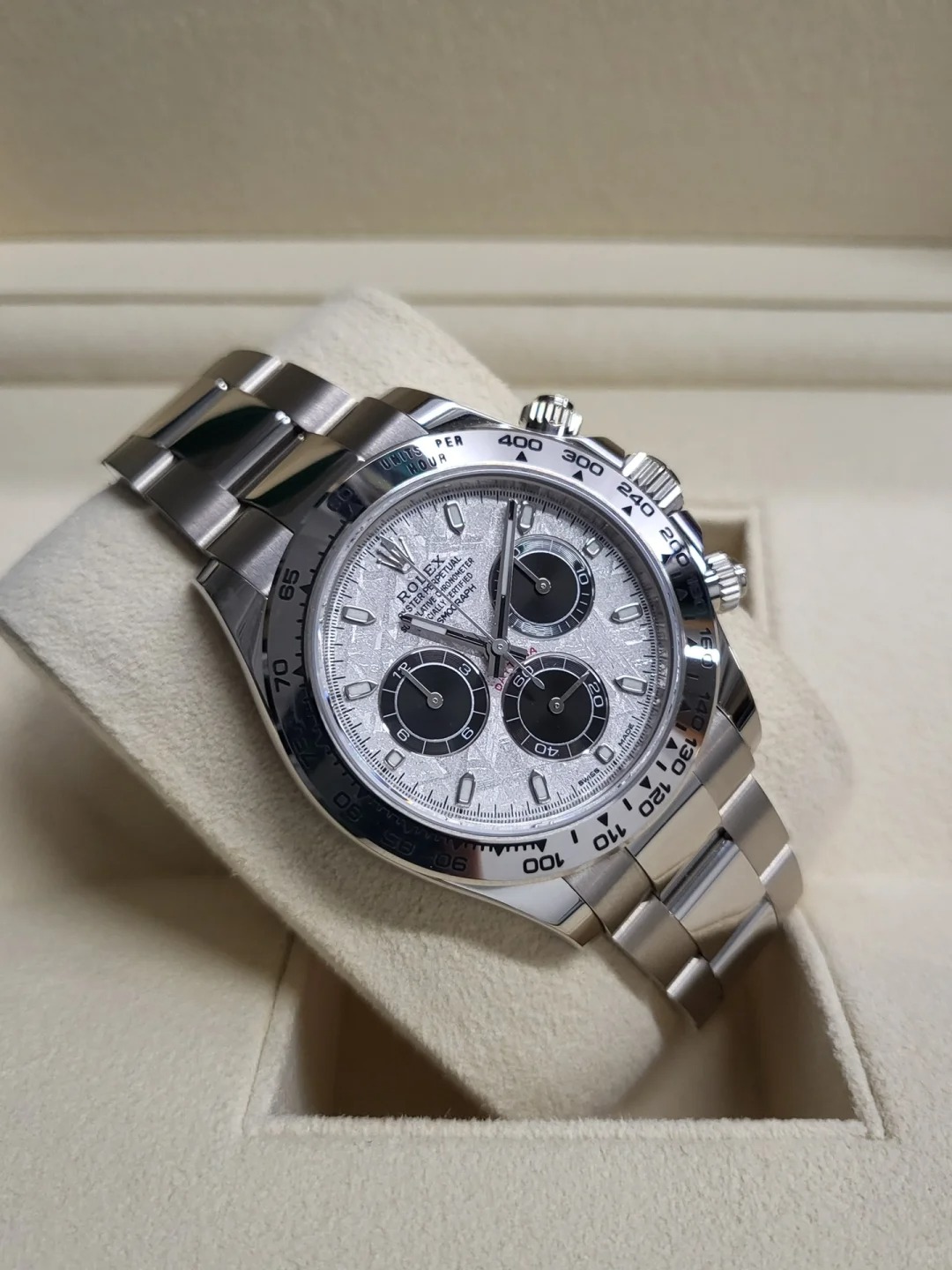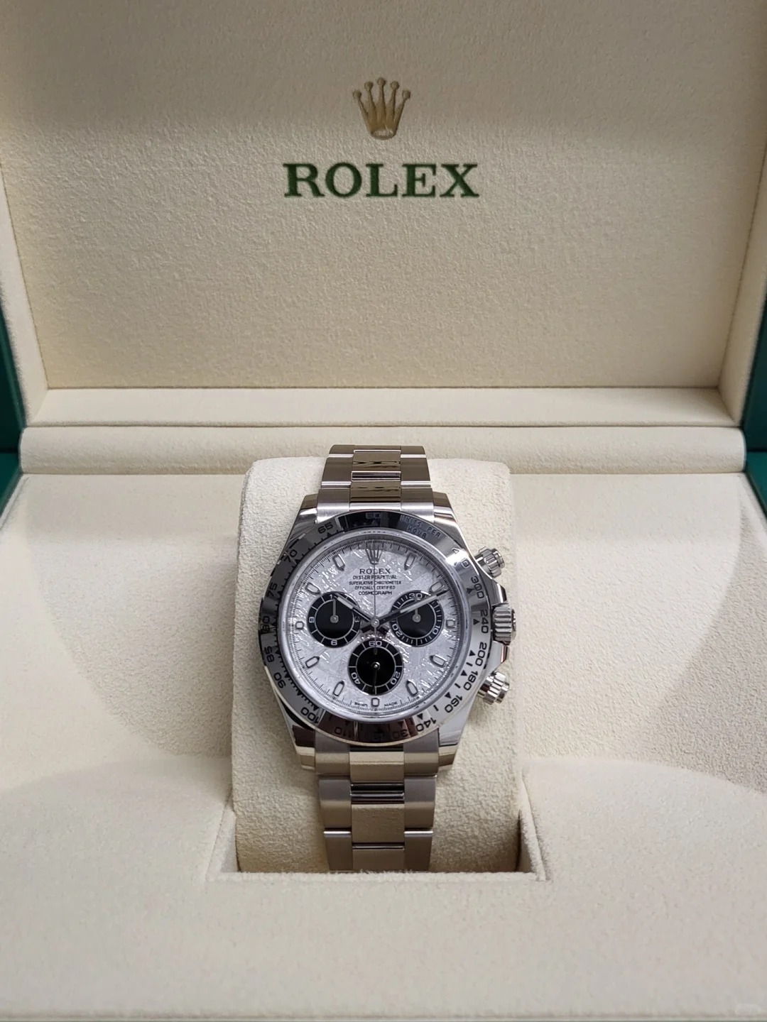 Rolex Cosmograph Daytona Men's Watch 116509-0073. This 40mm watch features a solid 18k white gold case, bezel and Oyster bracelet. The meteorite and black dial has luminescent hands and hour markers with a chronograph, small seconds, and a tachymeter scale on the bezel. It is powered by the Rolex Caliber 4130 self-winding automatic COSC Superlative Chronometer certified movement with a 72 hour power reserve.
