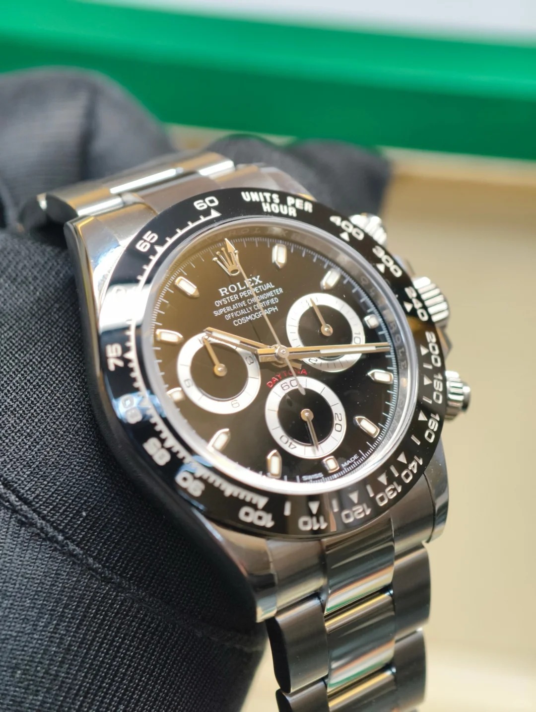 Rolex Cosmograph Daytona Oystersteel 116500LN men's watch. Features a polished with brushed 904L Oystersteel stainless steel case and brushed with polished 904L Oystersteel stainless steel Oyster bracelet. Black monobloc Cerachrom ceramic fixed bezel with engraved tachymeter scale. Black dial with Chromalight blue luminescent hands and index hour markers. Chronograph with large central chronograph seconds hand, 30 minute counter sub-dial at 3 o'clock and 12 hour counter sub-dial at 9 o'clock. Small seconds sub-dial at 6 o'clock. Stop-seconds feature for precise time setting. Powered by the Rolex Caliber 4130 self-winding automatic COSC Superlative Chronometer certified movement which boasts a 72 hour power reserve, beats at 28,800 vph and contains 44 jewels.