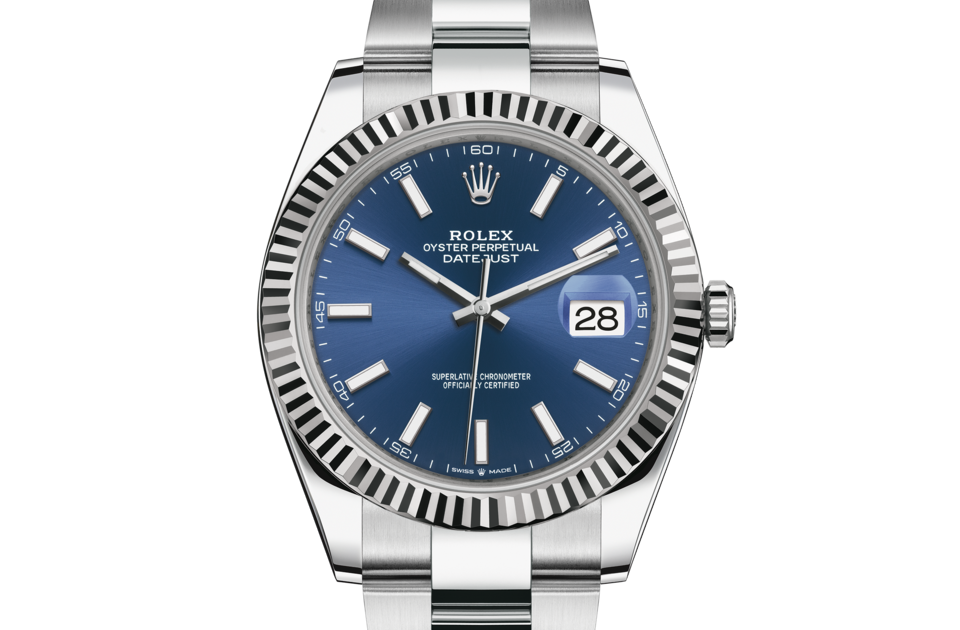 This Oyster Perpetual Datejust 41 in Oystersteel and white gold features a bright blue dial and an Oyster bracelet.