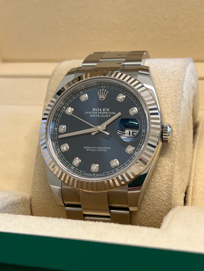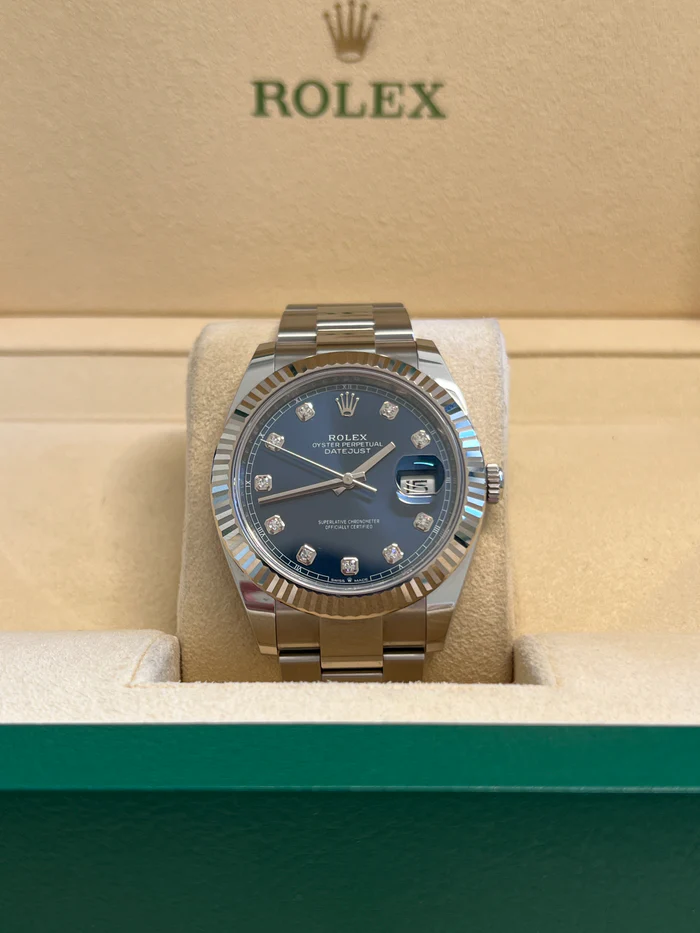 The Rolex Datejust 41 Men’s watch M126334-0015 is a Swiss-made luxury watch featuring a polished with brushed 904L Oystersteel stainless steel case paired with a polished with brushed 904L Oystersteel stainless steel oyster bracelet. The diamond hour markers and date aperture located at the 3 o’clock position are set against a blue dial encompassed in a solid 18k white gold fluted bezel. This bold watch is driven by COSC Superlative Chronometer Certified Self-winding automatic movement with 70 hour power reserve.