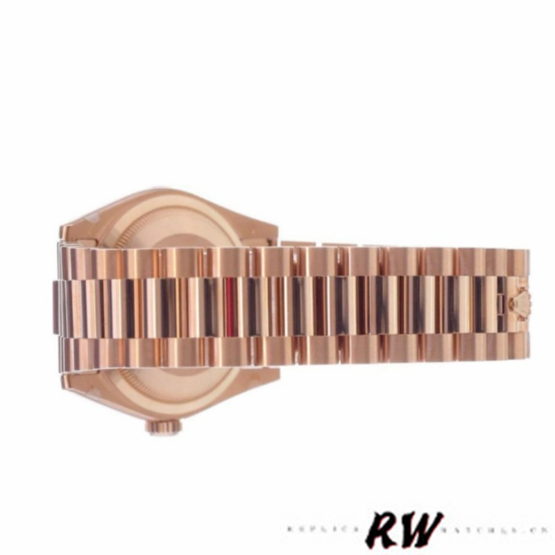 Rolex Day-Date 118235 Mother of Pearl Dial 36mm Unisex Replica Watch has a Rose Gold 36 mm Monobloc middle Case with Screw Down Crown and a Rose Gold Fluted Bezel. White mother-of-pearl with oxford motif set with diamonds.Centre hour, minute and seconds hands. Instantaneous date and day in windows on the dial with rapid setting. Stop seconds for precise time setting. Diamonds in gold settings and baguette-cut diamonds at 6 and 9 o'clock.The reliable Rolex Rose Gold President Bracelet will look great on your wrist.