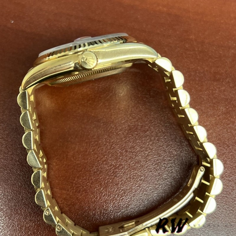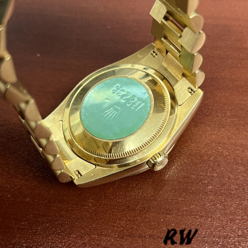 Rolex Day Date 118238 Black Diamond Dial 36mm Mens Replica Watch features a 36mm yellow gold case surrounding a black diamond dial with Sweep center seconds. Outer minute and 1/2 seconds divisions, aperture for day at 12, aperture for date at 3.The presence of a yellow gold Presidential semi-circular link bracelet with concealed folding Crownclasp and matching fluted bezel.