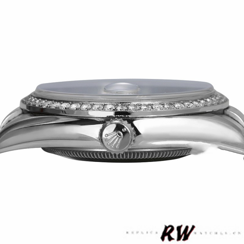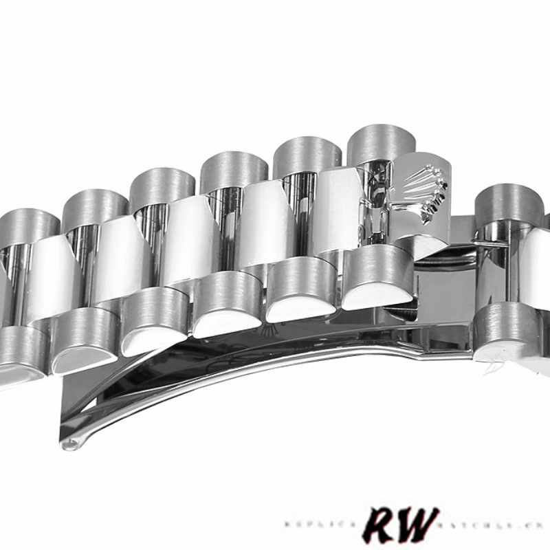 Rolex Day Date 118346 Roman Ice Blue Dial 36mm Unisex Replica Watch. 36mm Polished platinum case featuring Ice Blue Dial with Roman Numerals.The dial is surrounded by set round brilliant cut diamond bezel,Day of the week window displayed at the 12 o'clock position.Date window displayed at the 3 o'clock position with a cyclops magnifying lens.The elegantly designed Platinum with Concealed Folding Crownclasp will look great on your wrist.