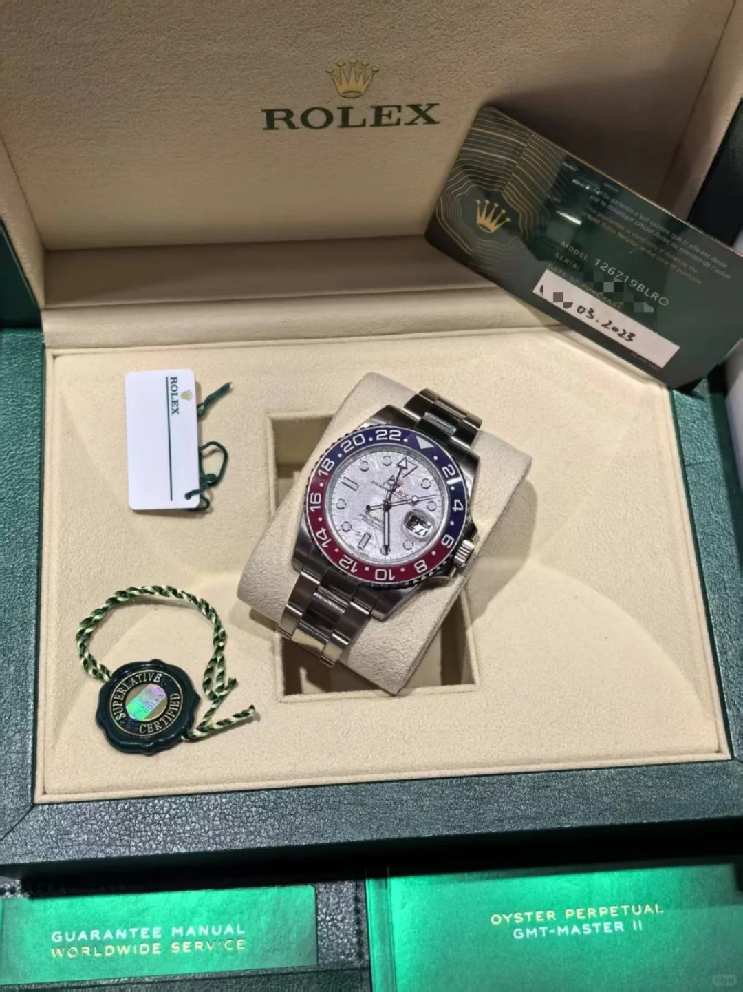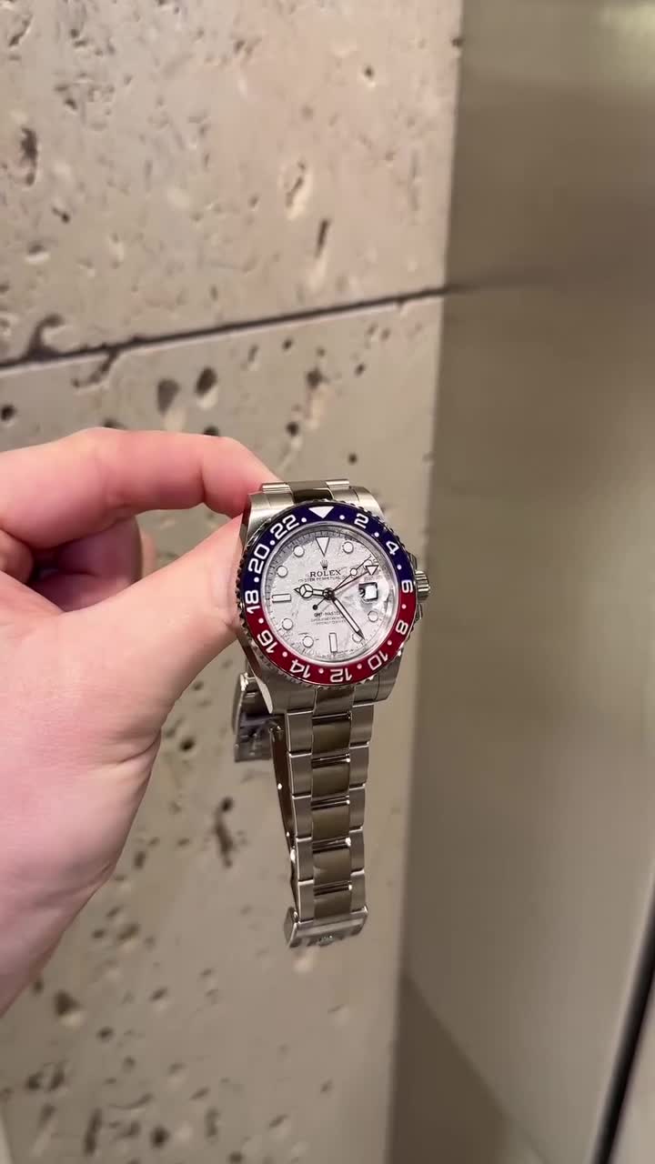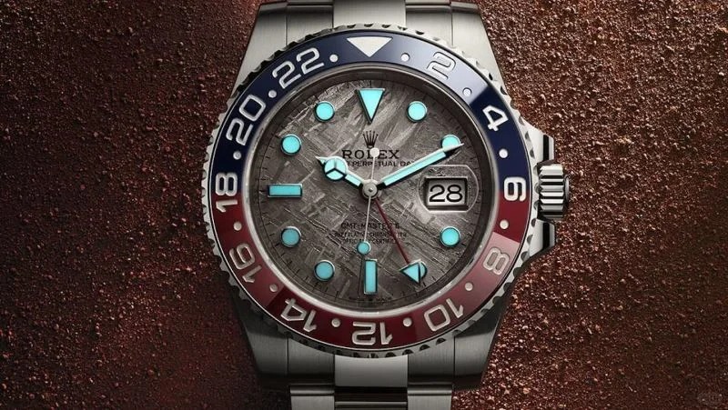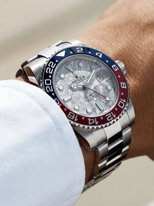 This model is the only GMT-Master II with a meteorite dial. Meteorite comes from the heart of an asteroid or possibly even a planet that has exploded, propelling material across the Solar System until chance brings it into our planet?s orbit and gravity pulls it to Earth. During its journey, the centre of the meteorite is gradually transformed, producing highly unusual metallic patterns, resulting from the very slow cooling of molten asteroid cores. The designers at Rolex create from these configurations a unique treasure for some of the most prestigious models, including this GMT-Master II.