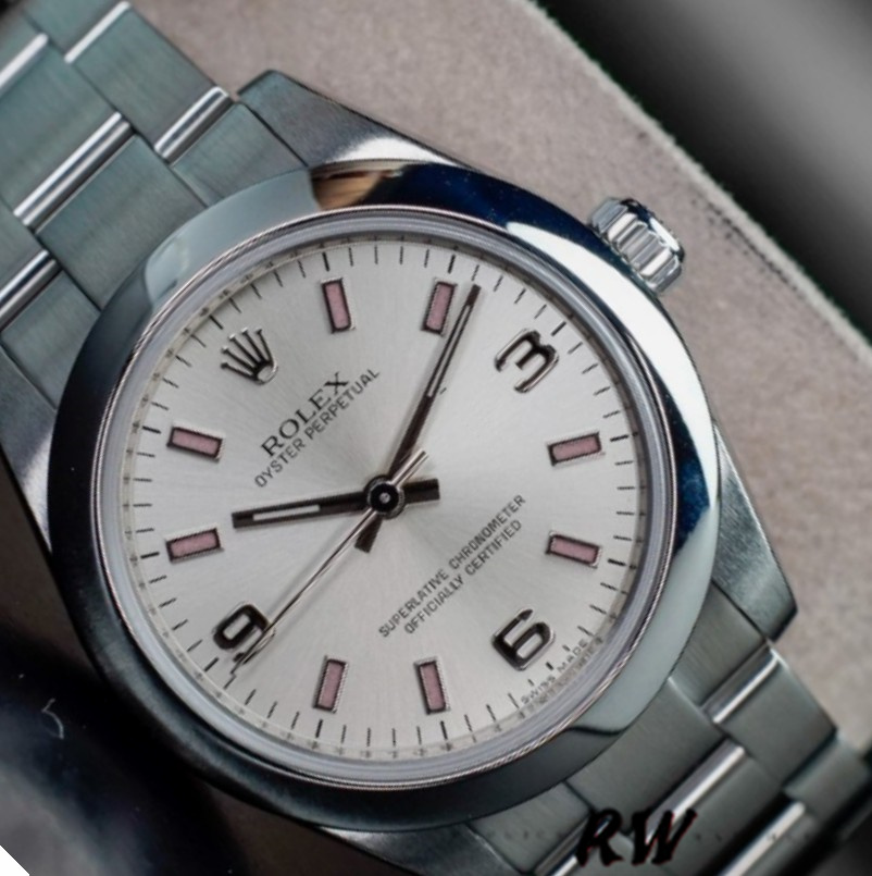 Rolex Oyster Perpetual 177200 Silver Dial Pink Markers 31mm Lady Replica Watch, 31mm Stainless steel oyster case in diameter. Stainless steel smooth domed bezel. Scratch resistant sapphire crystal. Silver dial with pink luminous baton hour markers and arabic numerals. Stainless steel oyster bracelet with a fold over clasp.