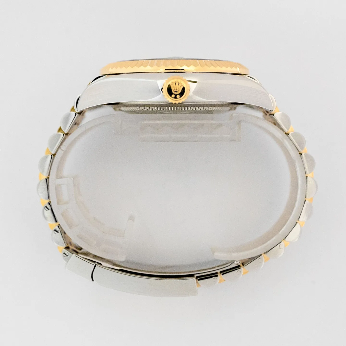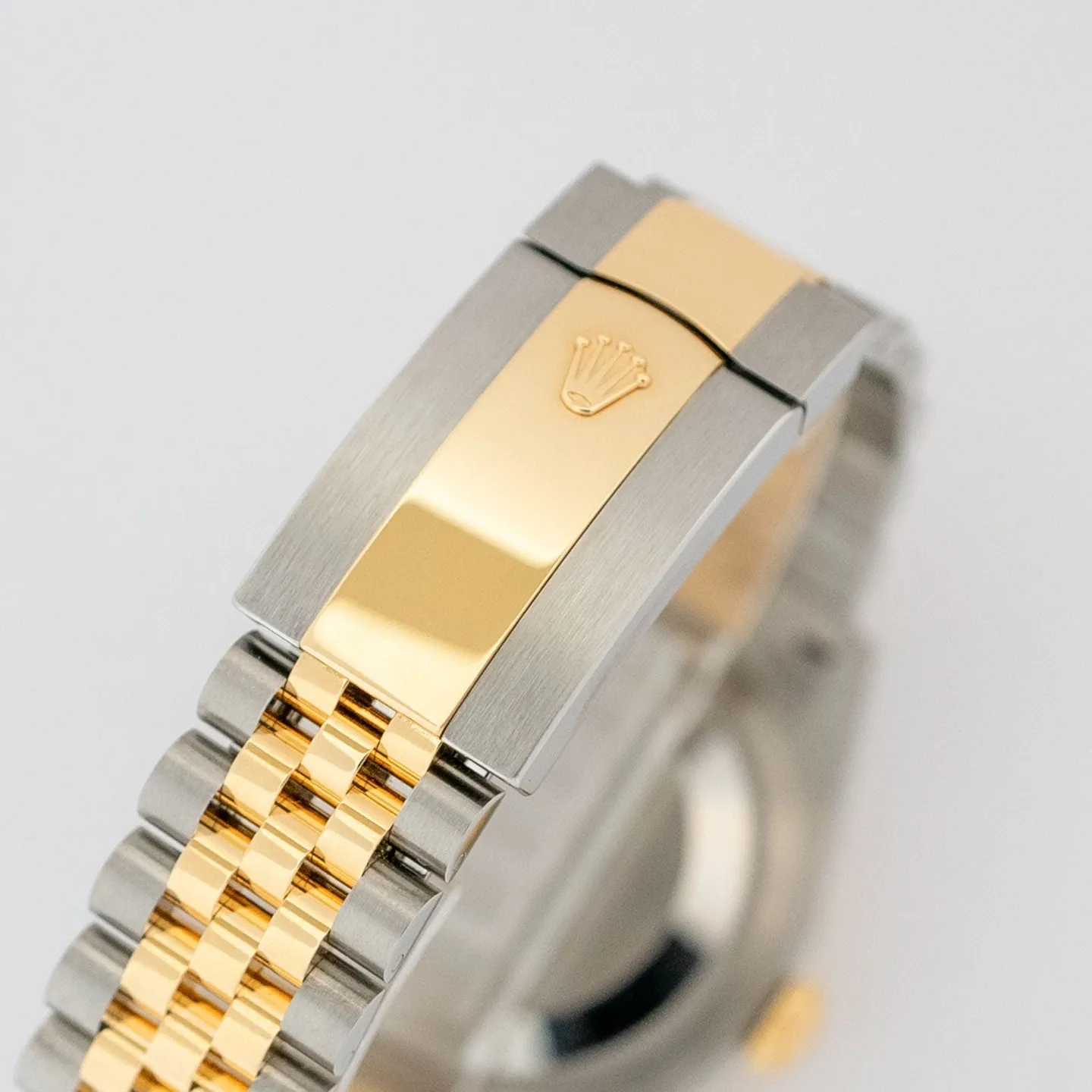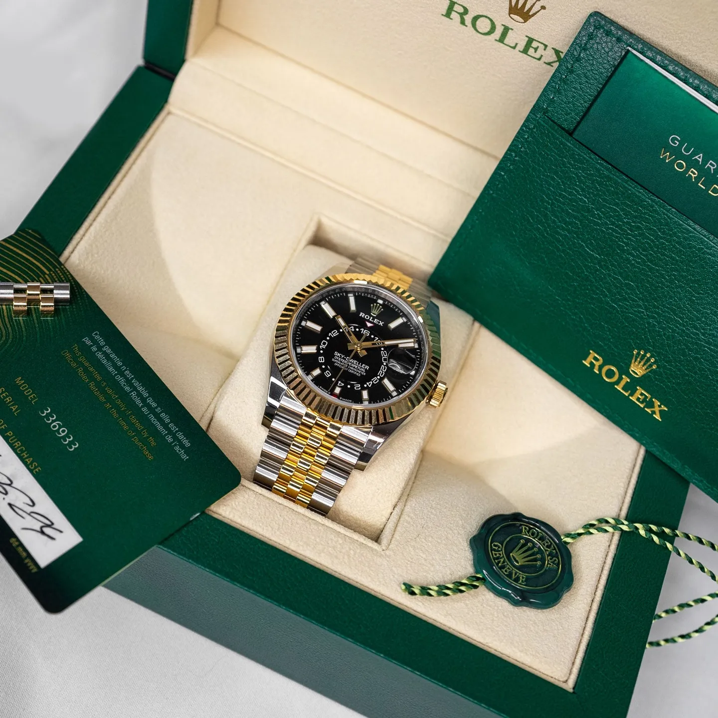 Unworn Rolex Sky-Dweller 42, 18k Yellow Gold and Stainless Steel Watch. Black Dial with luminous yellow gold-tone hands. Partially skeletonized minute and hour hands so as not to obscure the dual time. Index hour markers with luminous fill. Minute markers around the outer rim. Date display at the 3 o'clock position. Scratch-resistant sapphire crystal, screw-down solid case back, and crown of 18k Yellow Gold with logo Rolex. Twinlock crown featuring two sealed zones when the crown is screwed down: the first inside the tube of the crown, the second inside the winding crown itself. The watch has a center hour, minute, and seconds hands, 24-hour display on the off-center disc, second-time zone, Instantaneous annual calendar at 3 o'clock, and rapid-setting of the date. Month display via 12 apertures around the circumference of the dial. And they also have a function stop-seconds for precise time settings. The watch is equipped with a Fluted 18k Yellow gold bezel with bidirectional rotatable Rolex. The movement is mechanical self-winding Rolex caliber 9001, 72 hours of power reserve, 40 jewels, adjusted five positions, Paraflex shock system, and ring command setting system, Officially Certified Chronometer. The watch presented on Jubilee Bracelet, made of polished 18k Yellow Gold and brushed 904L Stainless Steel, with folding Oysterclasp with Easylink 5 mm comfort extension link. The water resistance is up to 100m/330ft.