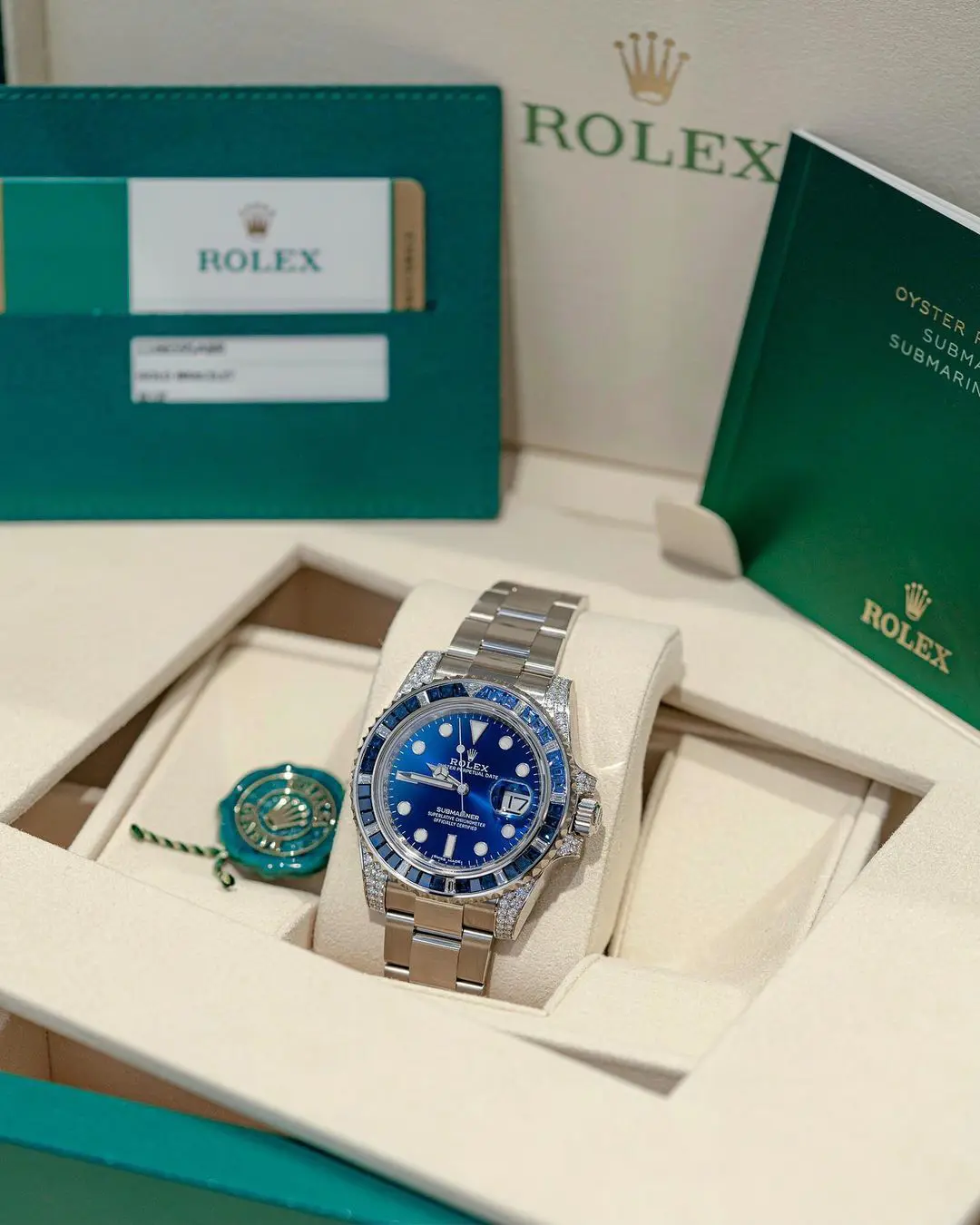 40mm 18K white gold case, screw-down back, end pieces and crown protector set with diamonds, screw-down crown with triplock triple waterproofness system, unidirectional rotating bezel set with sapphires and diamonds, scratch-resistant sapphire crystal with cyclops lens over the date, blue dial, Rolex calibre 3135 automatic movement with date at 3 o'clock, approximately 48 hours of power reserve, Oyster bracelet with flat three-piece links, Oysterlock folding safety buckle with Rolex glidelock extension system. Waterproof to 300 meters.