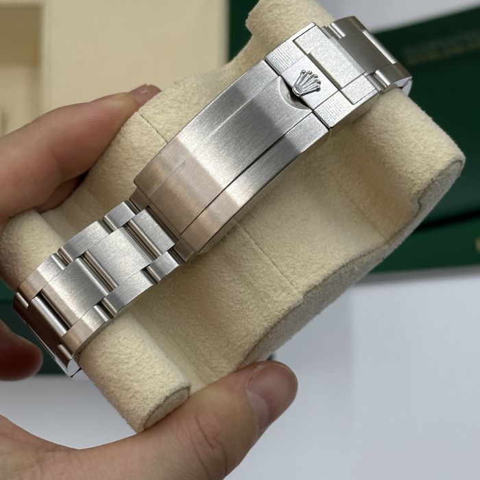 As you fasten the meticulously crafted 904L stainless steel bracelet around your wrist, you’ll appreciate the thoughtfully designed adjustable link and fold clasp, ensuring ultimate comfort and a perfect fit. The black dial, fondly nicknamed the Rolex Kermit, stands out with its bold yet refined stick and dot indices. The silver-tone, Mercedes-logo hands, and the sword and Breguet-style shapes enhance the watch’s aesthetics, ensuring it’s as striking as it is functional.