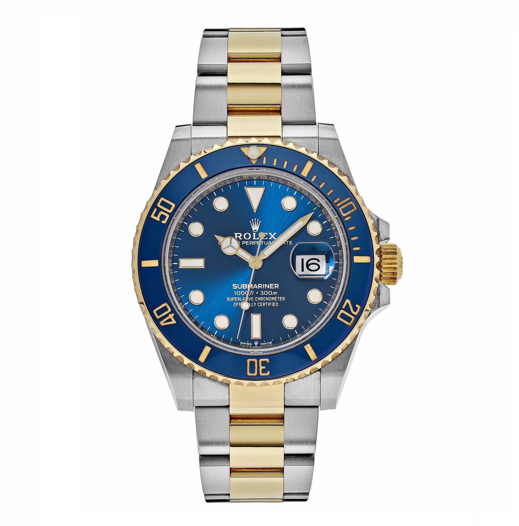 Stainless steel case with stainless steel and 18kt yellow gold oyster bracelet. Unidirectional rotating bezel. Blue dial with luminous hands and luminous dots hour markers. Luminescent hands and dial markers. Date display at the 3 o'clock position. Automatic movement. Scratch-resistant sapphire crystal. Case diameter: 40 mm. Water-resistant at 300 meters/ 1000 feet. Rolex Submariner Blue Index Dial Oyster Bracelet Men's Watch 116613LB.