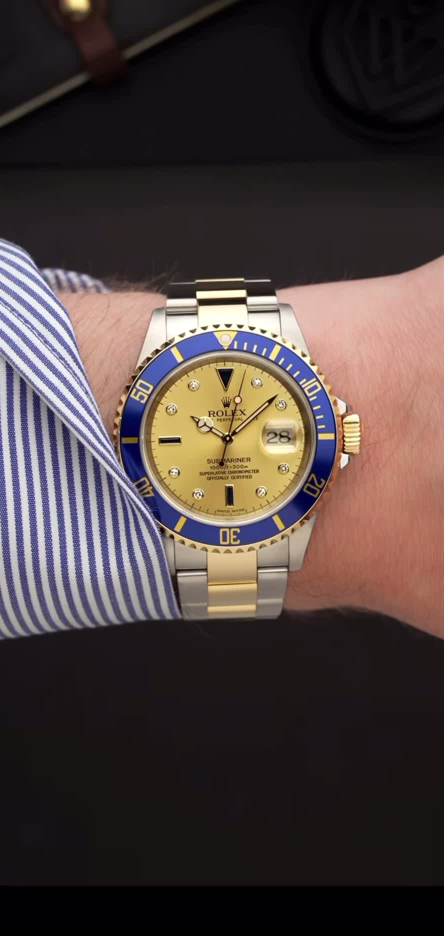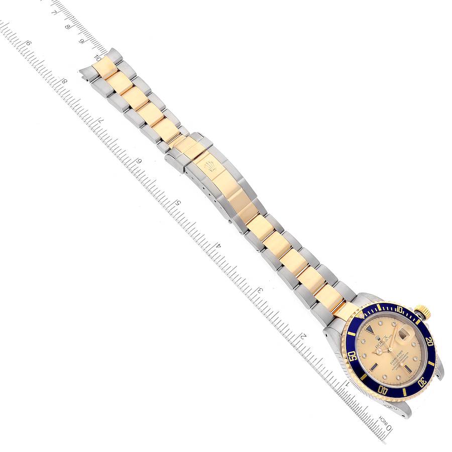 Rolex Submariner Date Men's Watch 16613. This 40mm watch features a stainless steel case with an 18k yellow gold bezel with blue aluminum insert and a two tone Oyster bracelet. The champagne dial has diamond and sapphire hour markers with a date window displayed under a cyclops lens at 3 o'clock. It is powered by the Rolex Caliber 3135 self-winding automatic COSC Superlative Chronometer certified movement with a 48 hour power reserve.