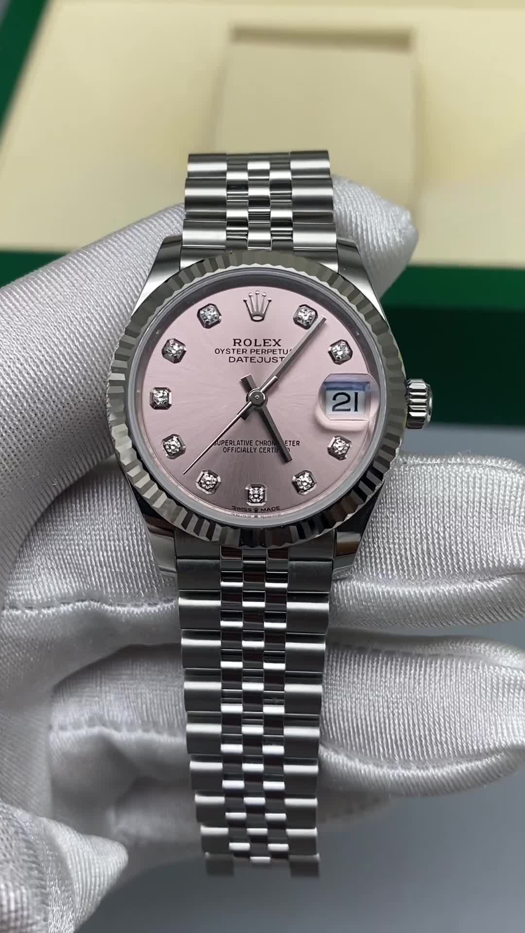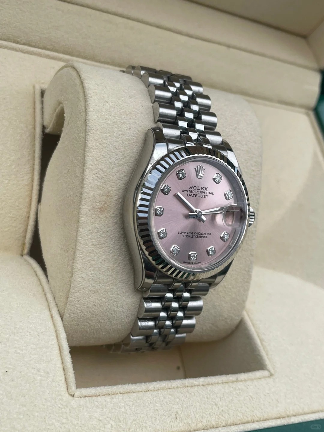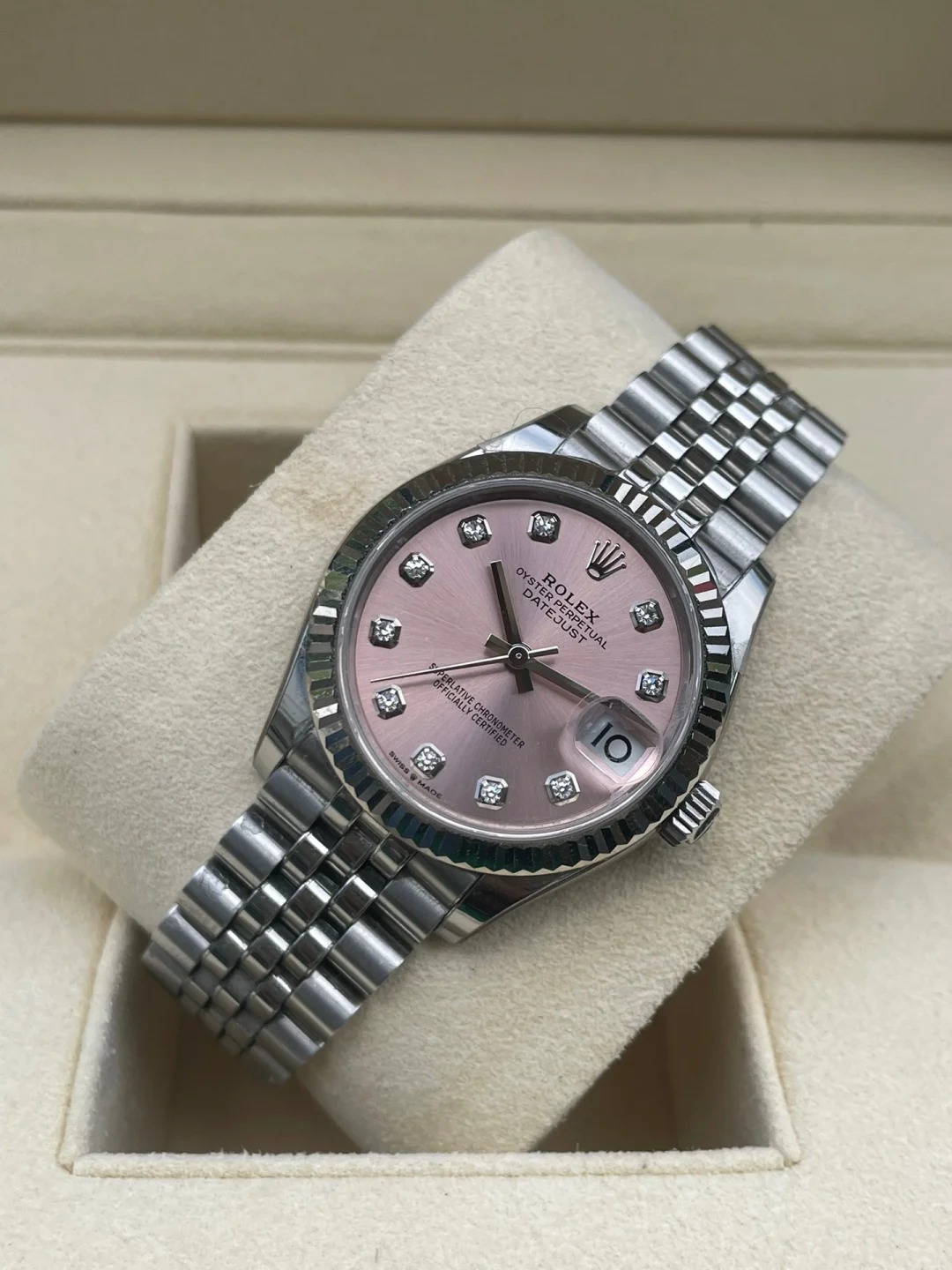 Polished Silver Hands and Roman Numeral Hour Markers and the Date Displayed on a Pink Dial.