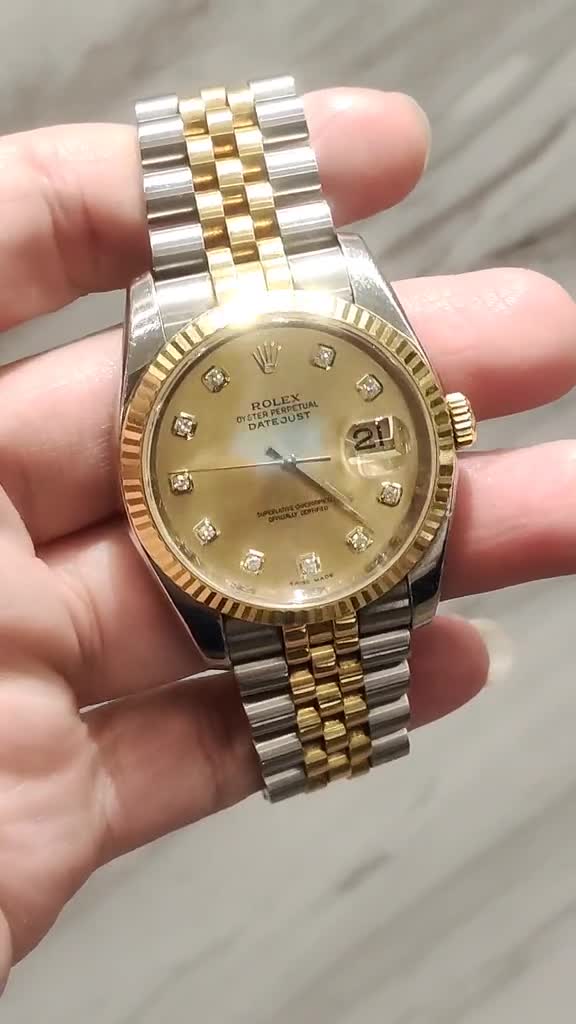 Rolex Datejust (116233) self - winding automatic watch, features a 36mm stainless steel case with an 18k yellow gold fluted bezel surrounding a champagne diamond dial on a stainless steel and 18k yellow gold Jubilee bracelet with folding buckle.