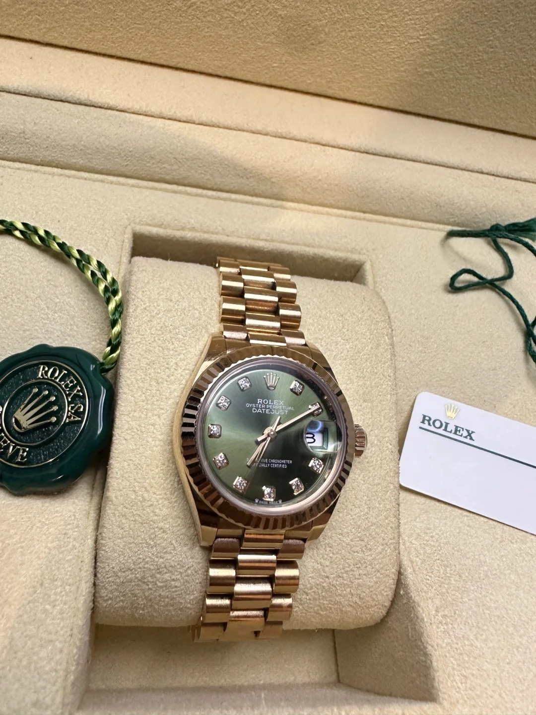 The Rolex fluted bezel is a mark of distinction. Originally, the fluting of the Oyster bezel had a functional purpose: it served to screw the bezel onto the case helping to ensure the waterproofness of the watch. It was therefore identical to the fluting on the case back, which was also screwed onto the case for waterproofness, using specific Rolex tools. Over time, the fluting became an aesthetic element, a genuine Rolex signature feature. Today the fluted bezel is a mark of distinction, in gold on this Lady-Datejust.