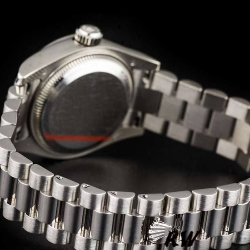 Rolex Datejust 179179 Pink Dial Fluted Bezel 26MM Lady Replica Watch,26mm white gold oyster case in diameter. White gold fluted bezel. Scratch resistant sapphire crystal with cyclops magnifier.Pink dial with diamond hour markers. Date calendar at 3 o'clock aperture. White gold president bracelet with hidden clasp.