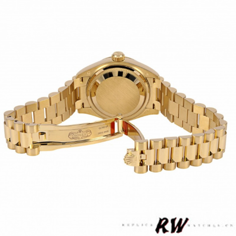 Rolex Datejust 279178 Lilac Purple Dial Fluted Bezel 28mm Lady Replica Watch, has a yellow gold 28 mm Round Case with Screw Down Crown and a yellow gold Fluted Bezel.Lilac Purple dial with Index Diamond hour marker. A Diamond-filled Roman numeral IX at the 9 o'clock position.Yellow gold President bracelet with semi-circular three-piece links, concealed folding Crownclasp buckle.