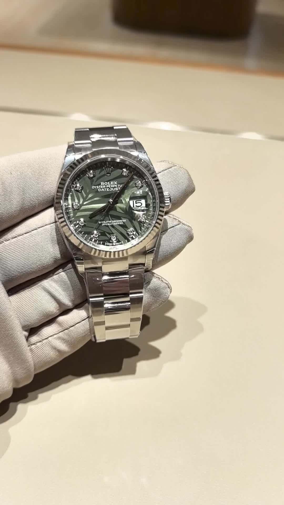 Unworn Rolex Datejust 36mm, Oystersteel, and 18k White Gold watch. They have an Olive green, palm motif Dial, index hour markers fashioned from 18k gold. Minute markers around the outer rim. Highly legible Chromalight display with long-lasting blue luminescence. Monobloc middle case, solid screw-down case back, and winding crown. Scratch-resistant sapphire, Cyclops lens over the date. Date window located at the 3 o'clock position. The Fluted 18k White Gold bezel. The movement is mechanical self-winding, caliber 3235 with 31 jewels and 70 hours of power reserve. The Oystersteel Oyster bracelet of flat three-piece links. Folding Oysterclasp with Easylink 5mm comfort extension link. The water resistance is up to 100m/330ft. The Watch comes complete with store papers and a Rolex box. Will include 3 years Store Warranty.